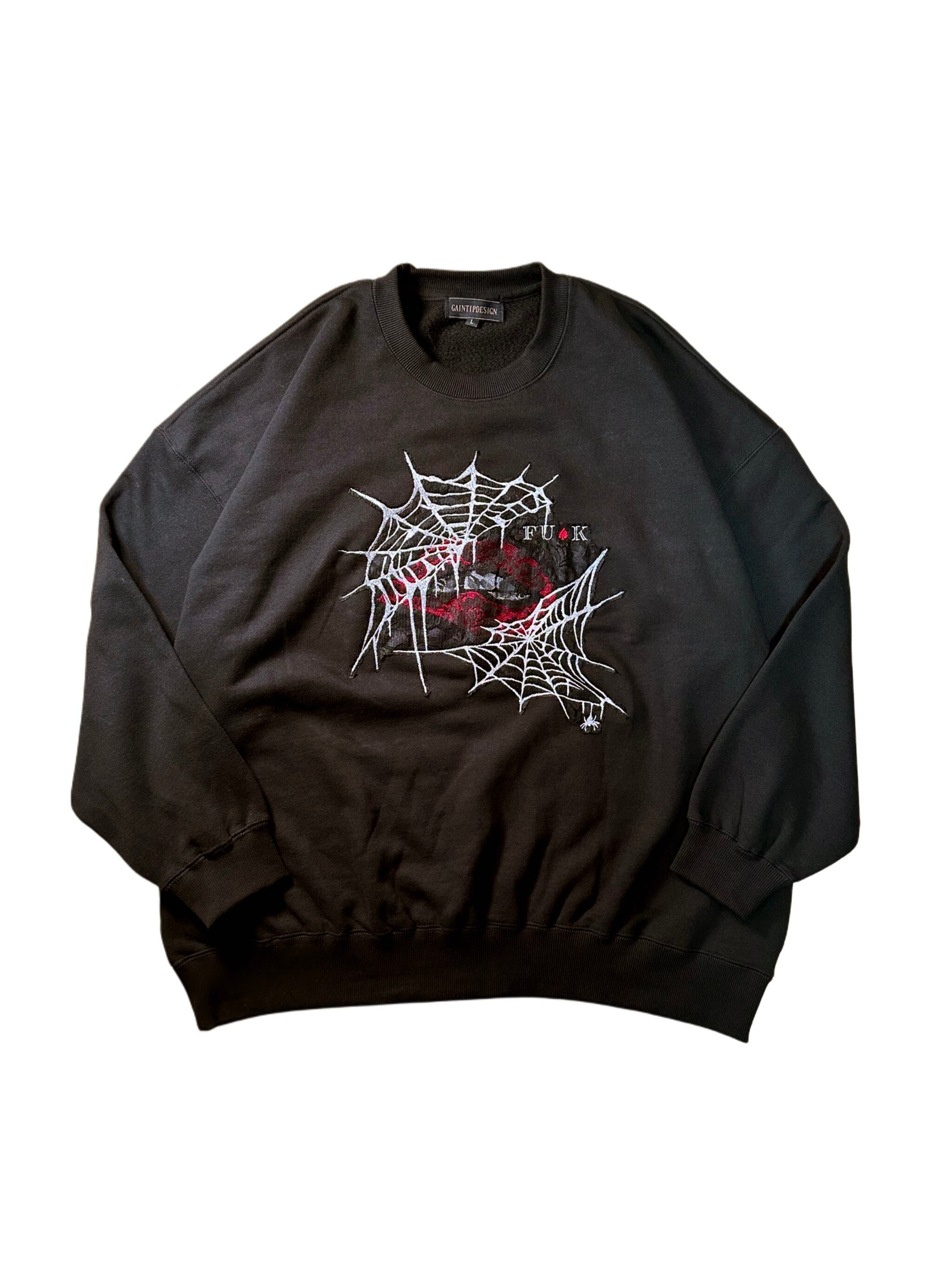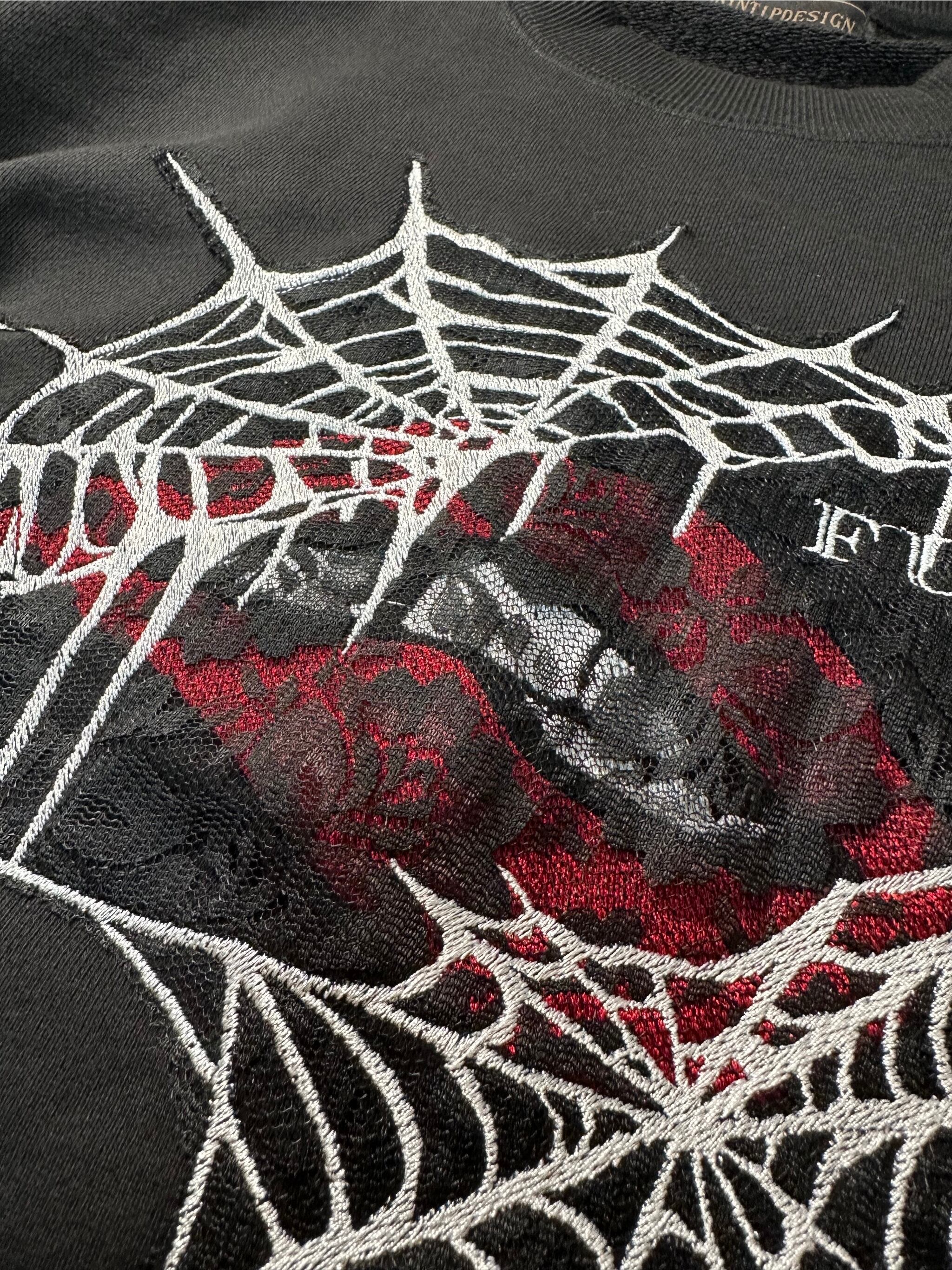 This intricate layering of textures reconstructs the natural three-dimensionality of spider silk, bringing depth and venomous allure to an otherwise flat sweatshirt.