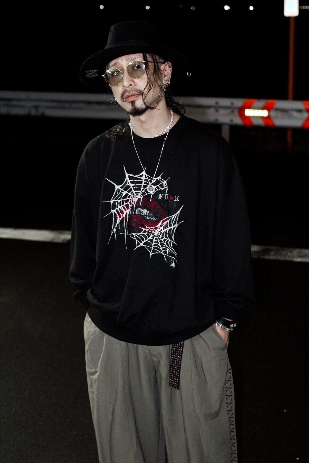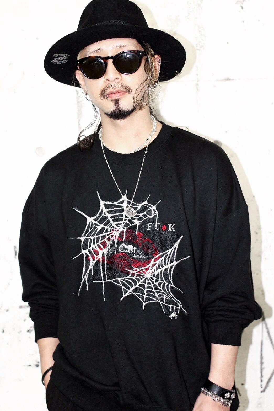 フロントには、刺繍で表現した“唇”に繊細なレース生地を重ね、さらにその上から蜘蛛の巣とロゴを刺繍。