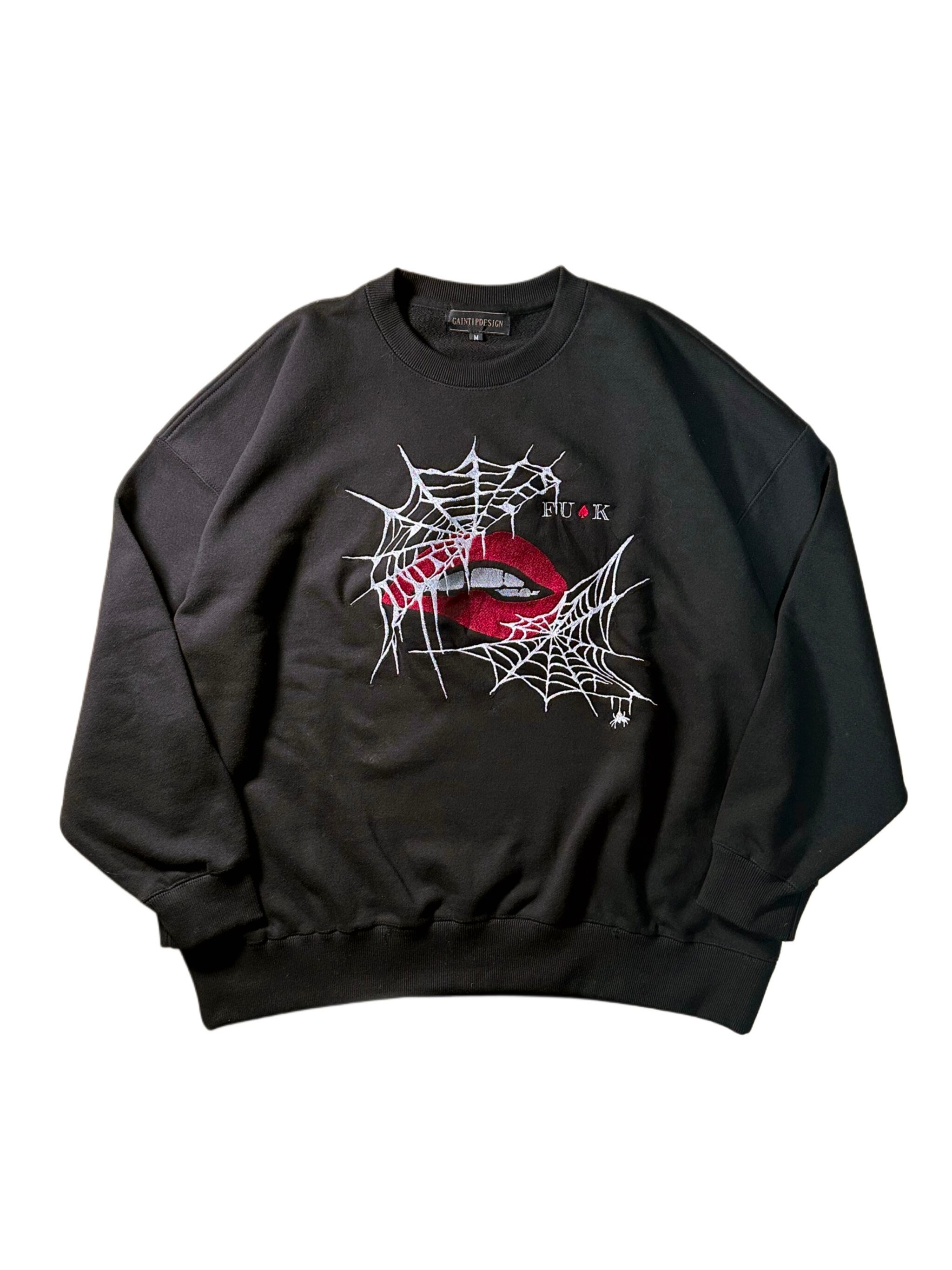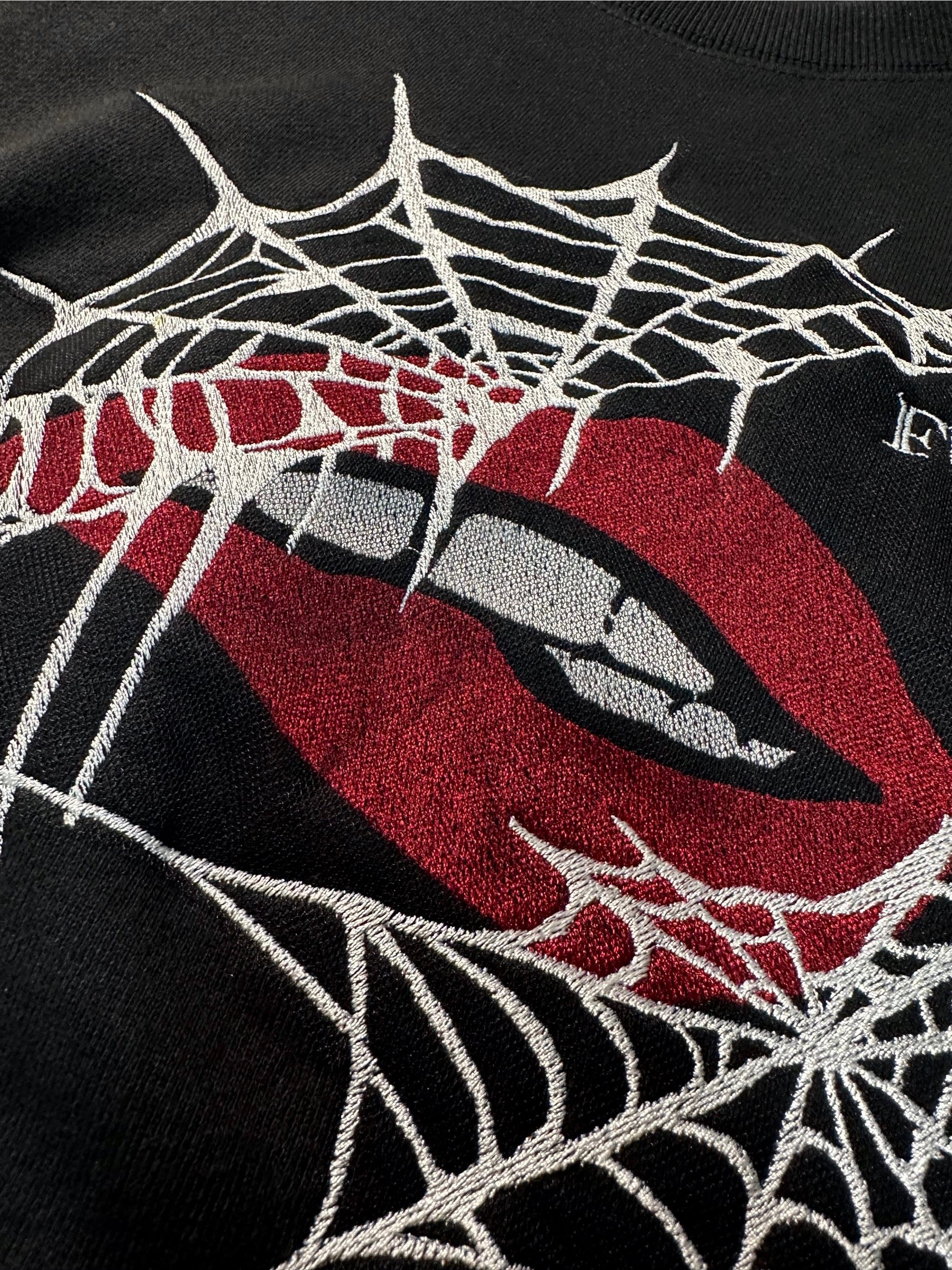 This intricate layering of textures reconstructs the natural three-dimensionality of spider silk, bringing depth and venomous allure to an otherwise flat sweatshirt.