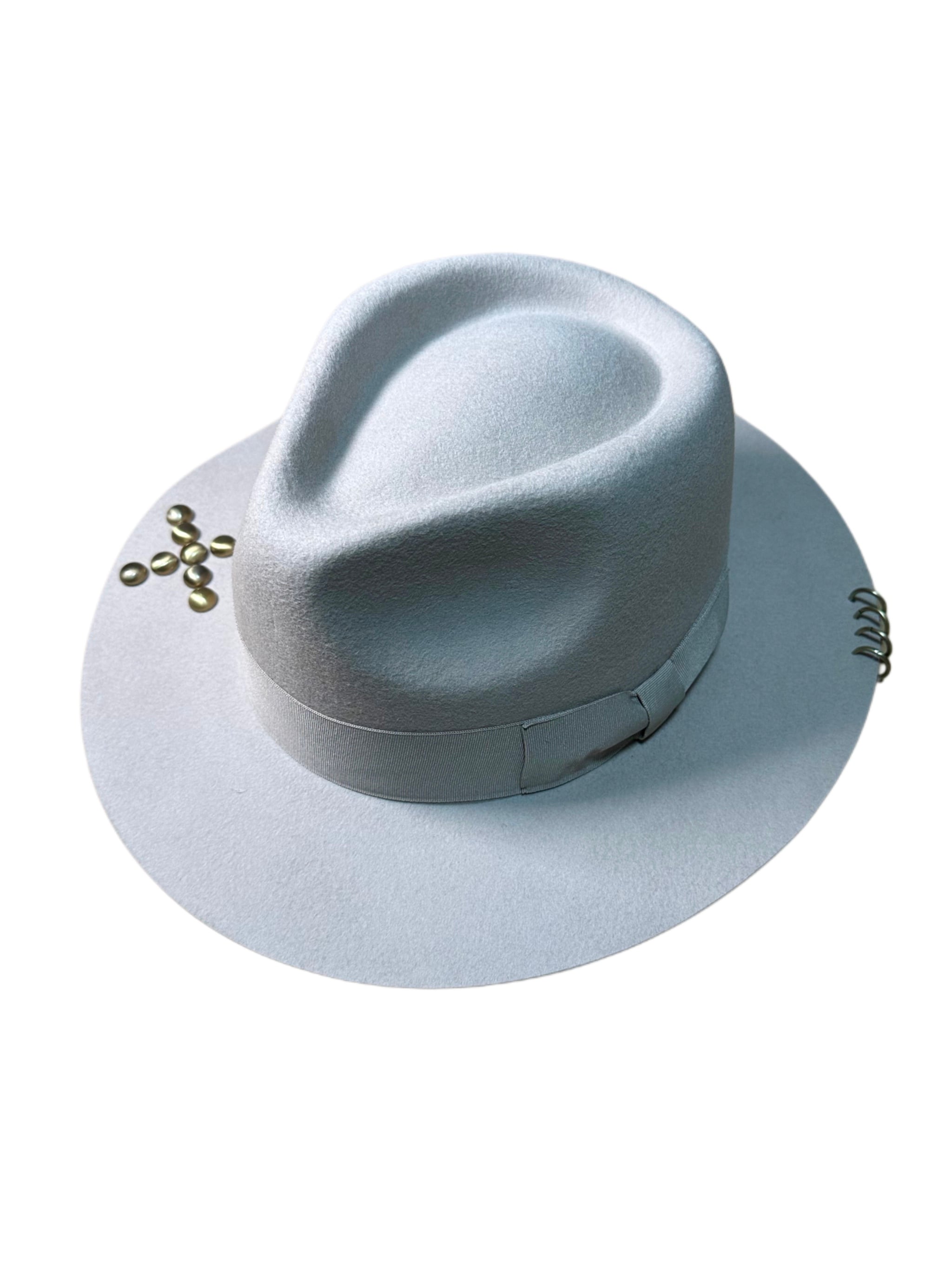 ×のスタッズが象徴的なロングブリムハットです。