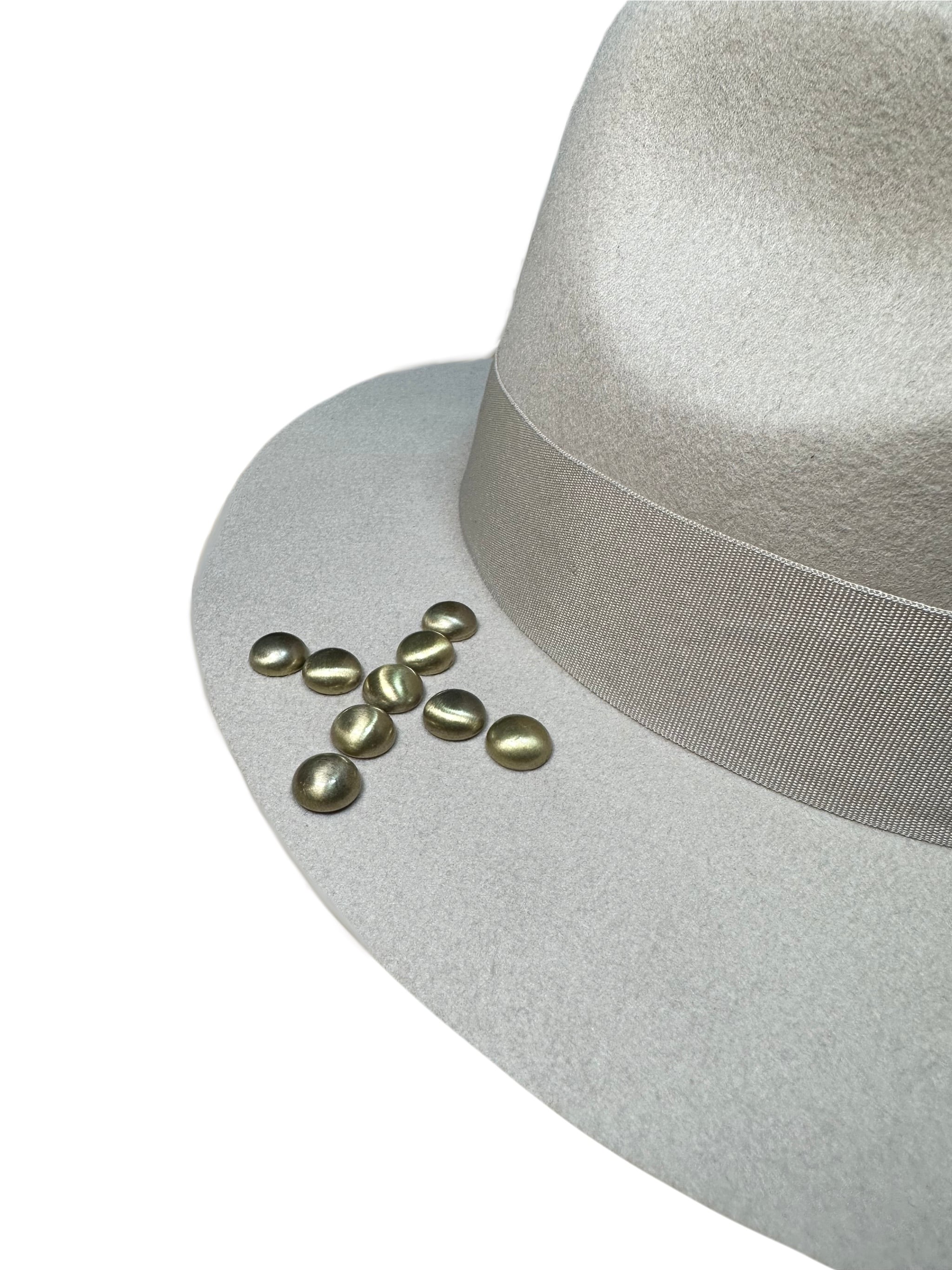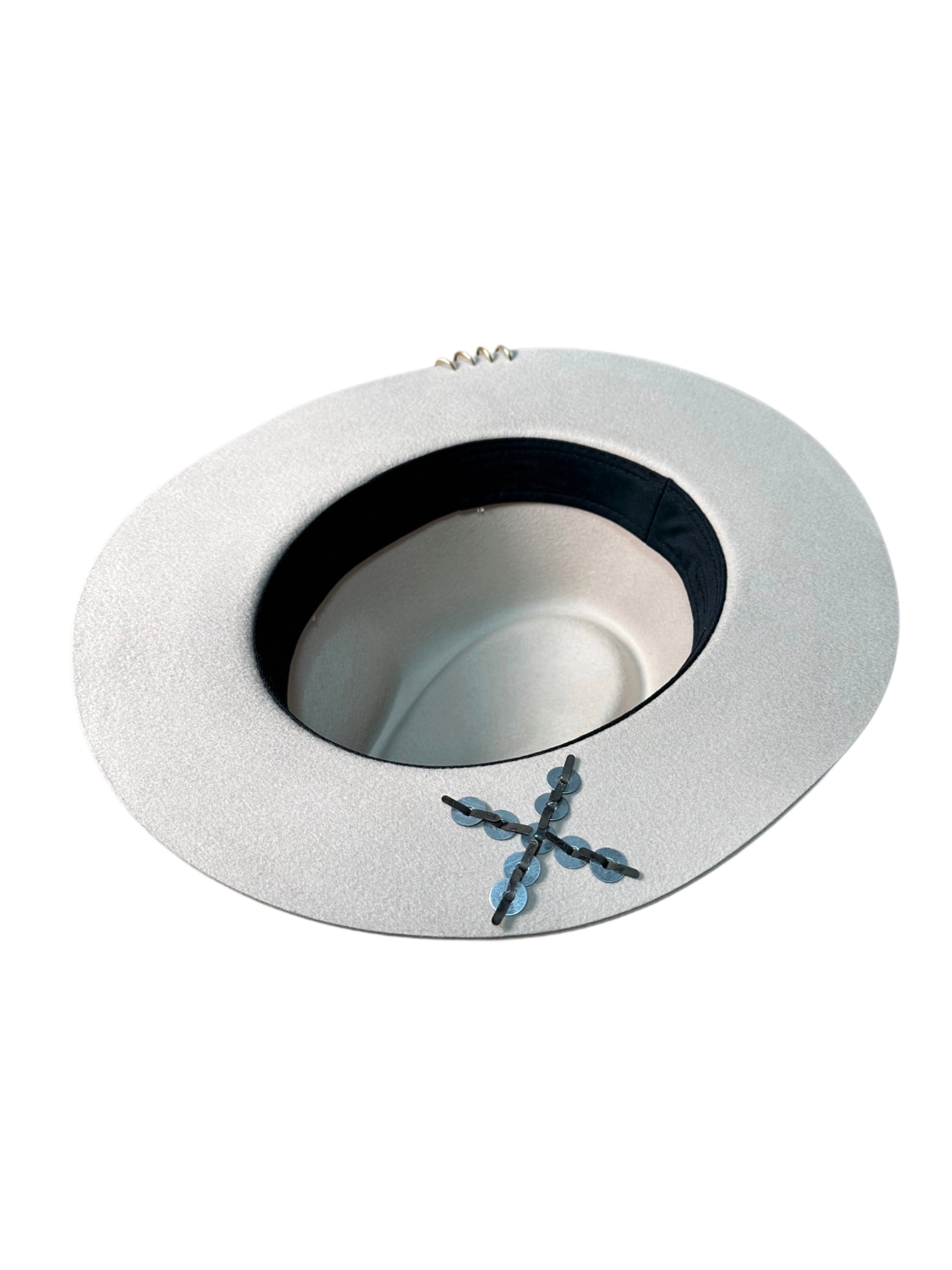 特徴的な“×”模様のスタッズワークは、ブリムの表では装飾として、裏では留め具が“×”を描き、上からも下からもデザインが成立する設計。