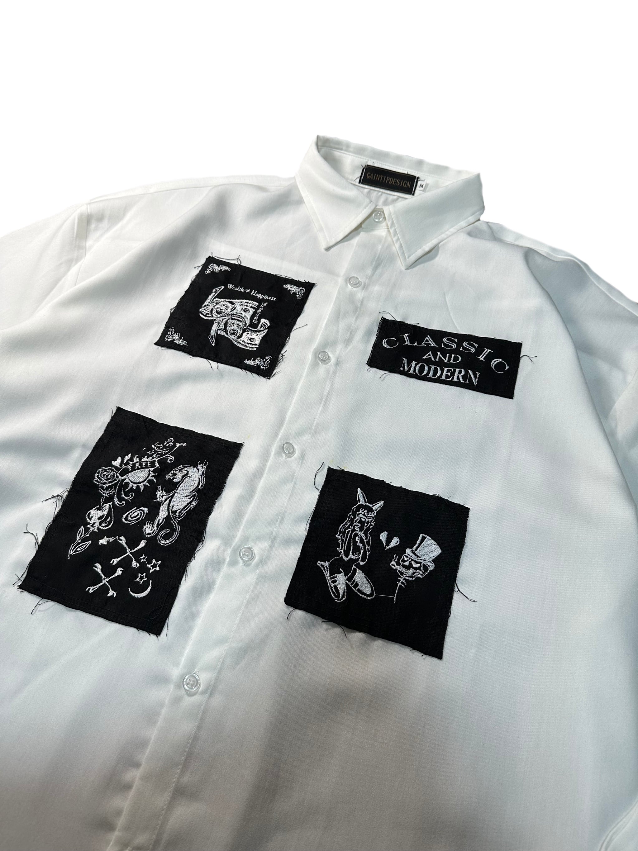 The four front patches, arranged like windows, serve not as mere decoration, but as visual frames capturing fragments of a deeper world.