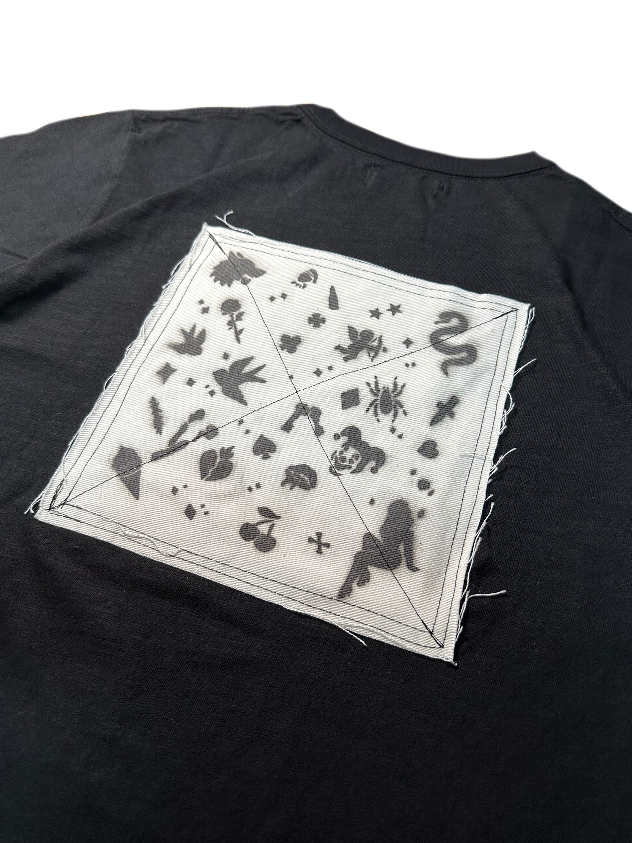 In this piece, we preserve that classic character while adding a stitched-on patch with stencil printing on the back.