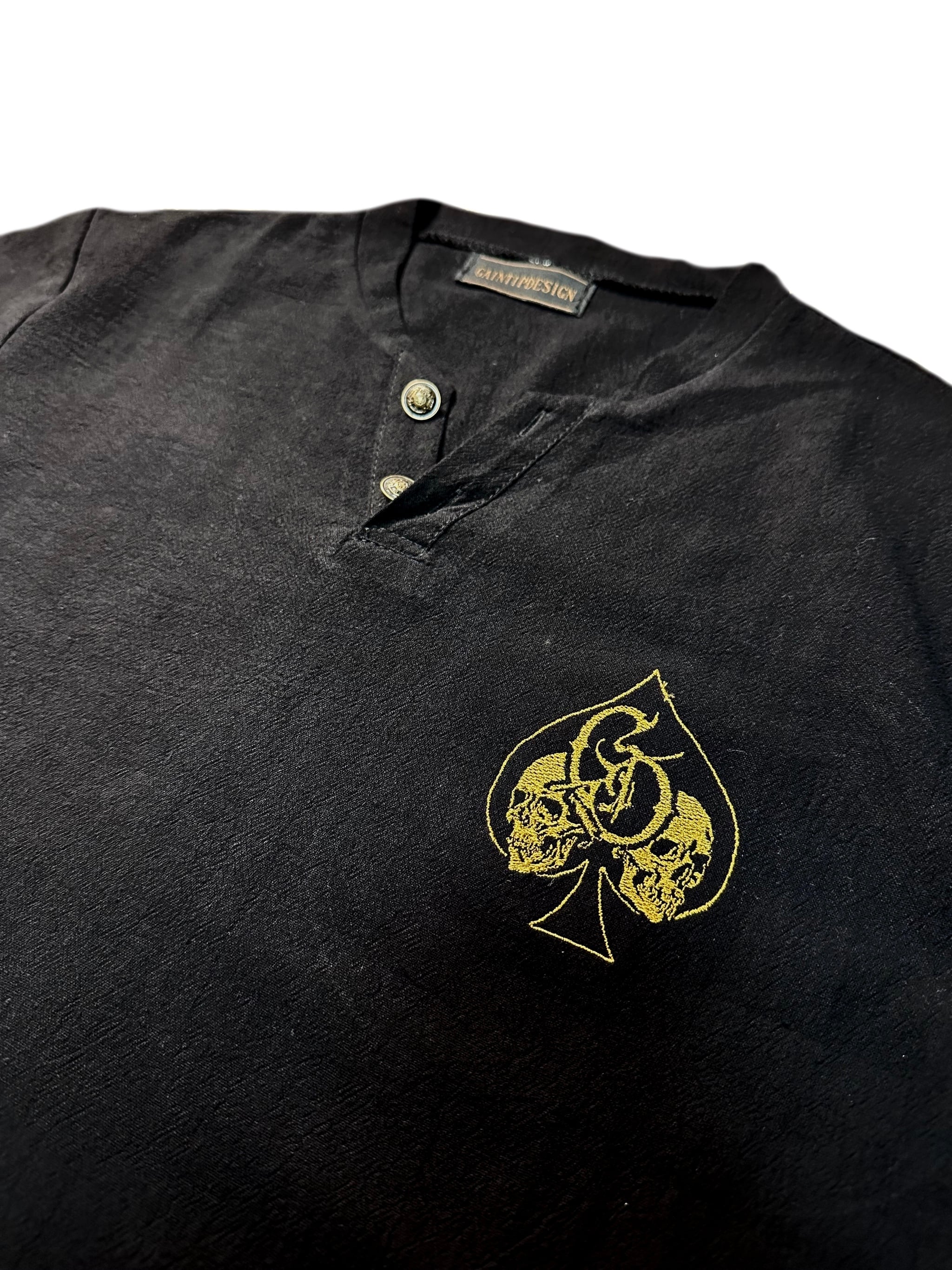 In harmony with the metal buttons at the neckline, the chest is adorned with a GTD monogram embroidery, combining a spade and skull motif. This graphic detail transforms what could be just a simple summer pullover shirt into a piece with undeniable presence and a distinctly rude nuance, setting it apart as more than just a basic item. Balancing lightness and toughness, it elevates styles across both street and rude aesthetics—an essential shirt you will truly want to experience for yourself.