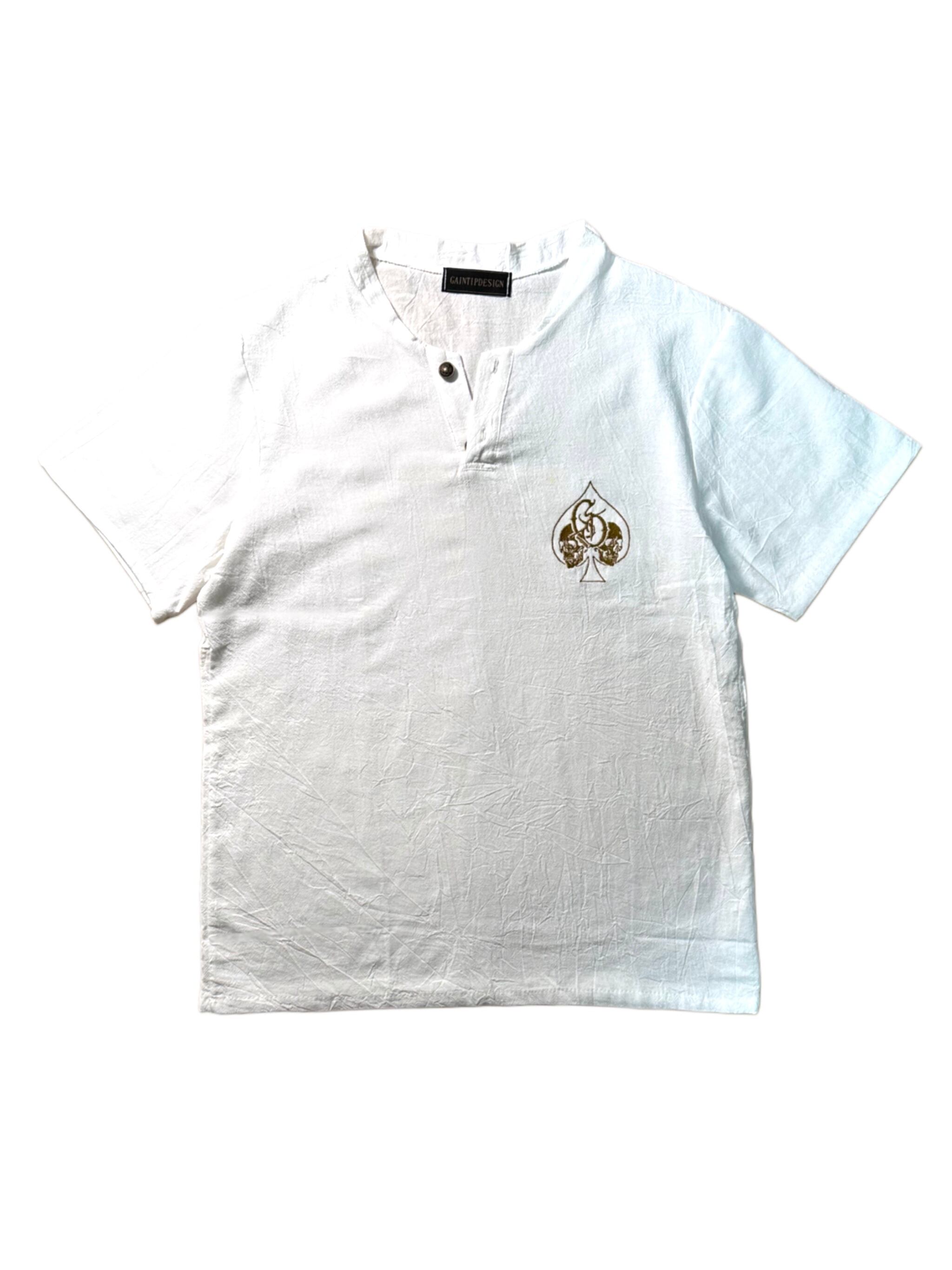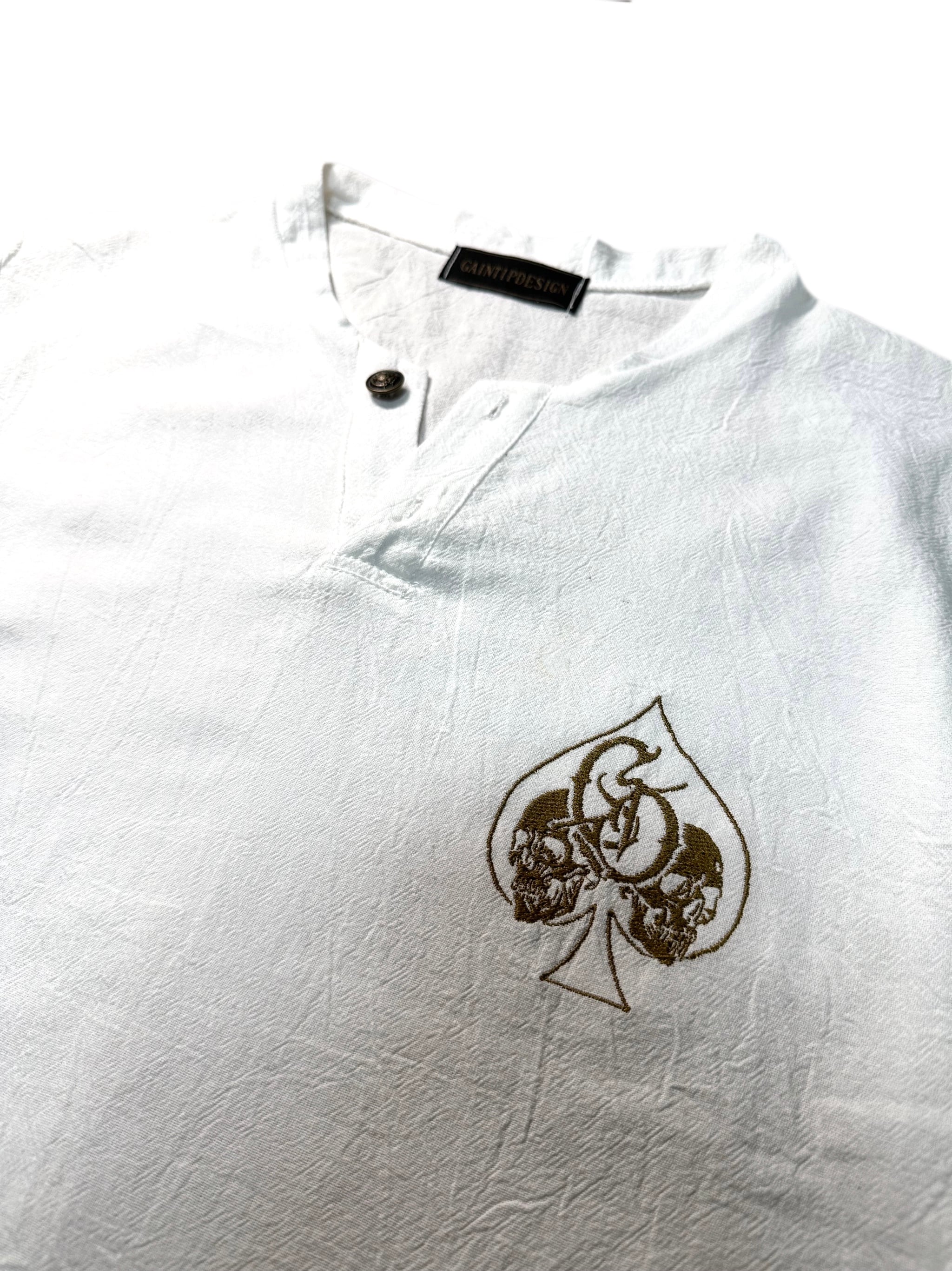 In harmony with the metal buttons at the neckline, the chest is adorned with a GTD monogram embroidery, combining a spade and skull motif. This graphic detail transforms what could be just a simple summer pullover shirt into a piece with undeniable presence and a distinctly rude nuance, setting it apart as more than just a basic item. Balancing lightness and toughness, it elevates styles across both street and rude aesthetics—an essential shirt you will truly want to experience for yourself.