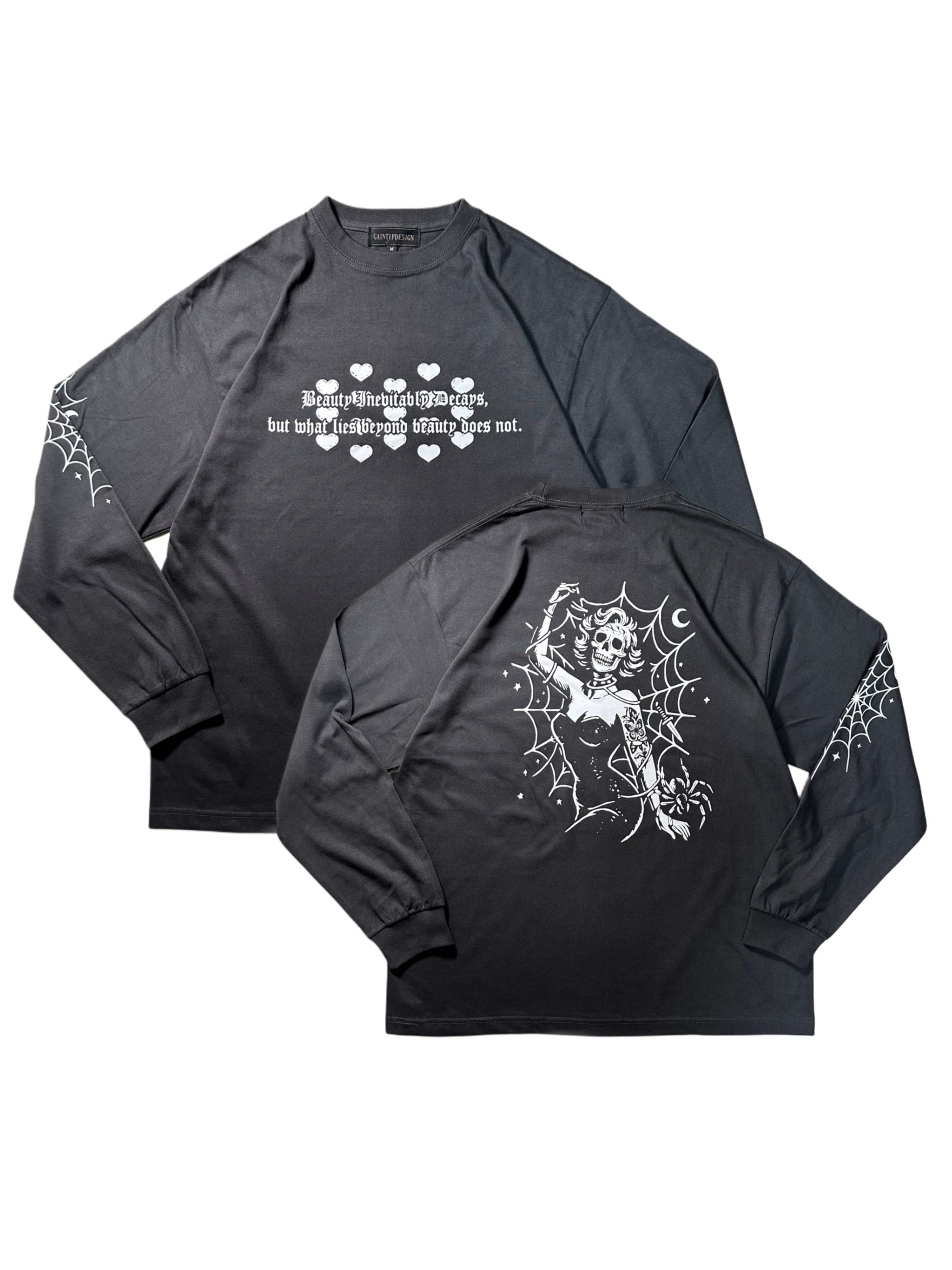 The back depicts a skeletal woman trapped in a spider’s web—an image symbolizing those who are bound by superficial beauty, unable to move, and destined to decay.