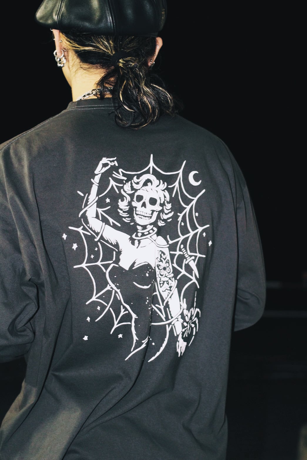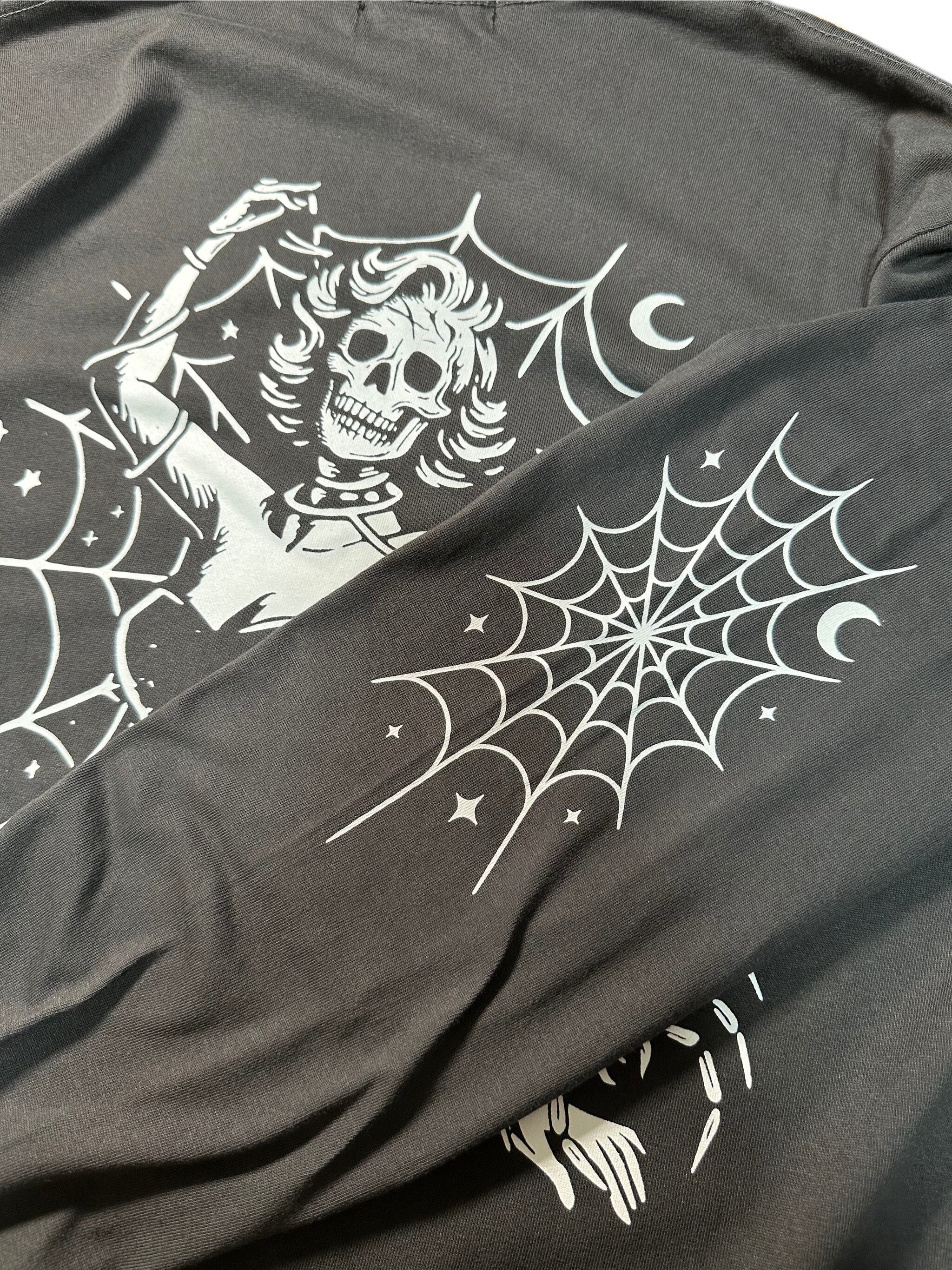 バックには、蜘蛛の巣に絡め取られた骸骨の女性を描写。