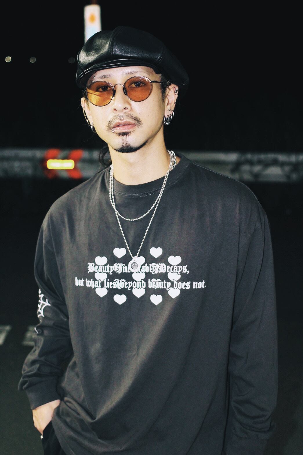 By borrowing the artist’s iconic heart, the design layers the message with the timeless power of music and art, giving the front print deeper resonance.