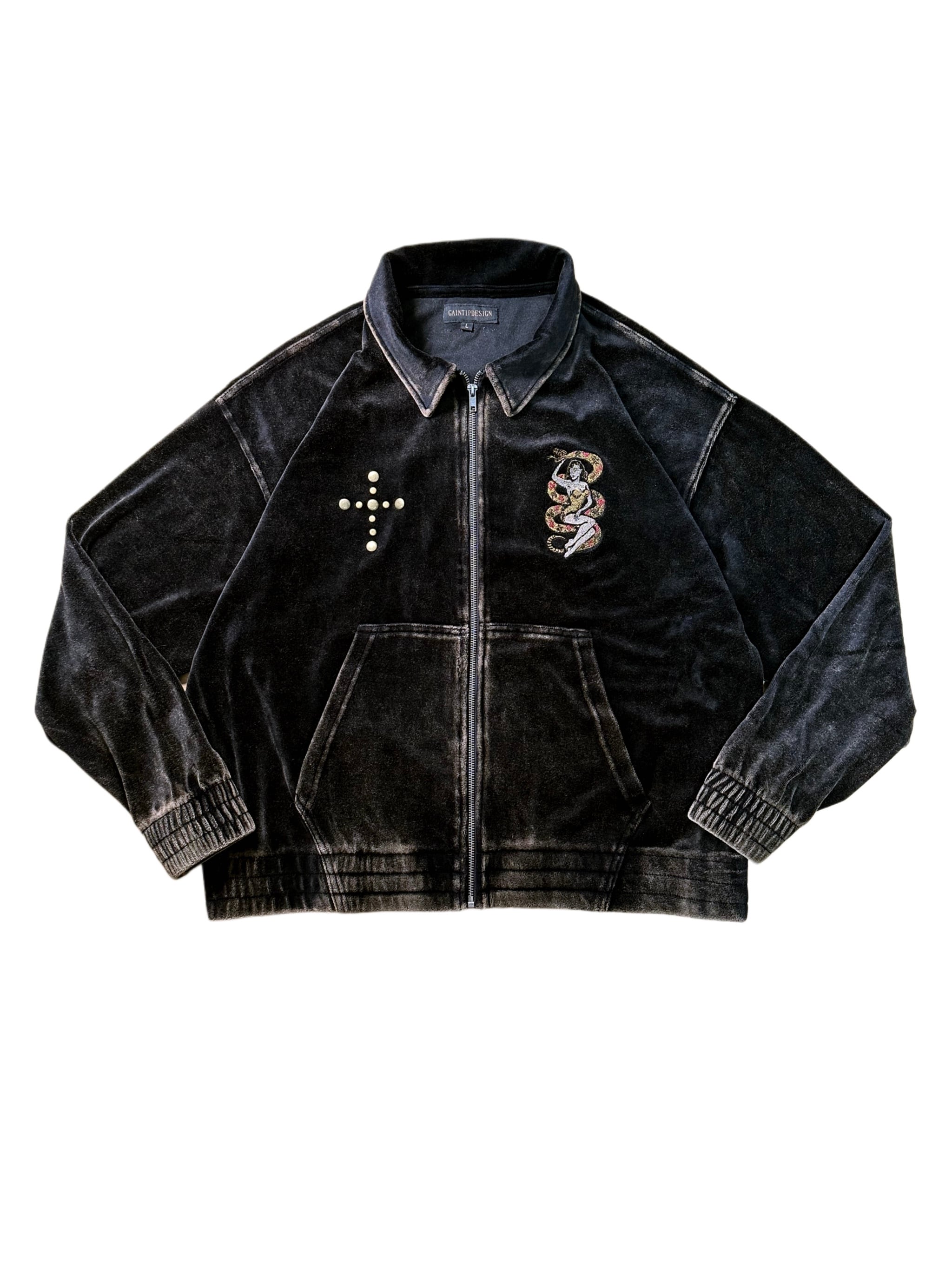 The back features an embroidered pin-up girl entwined with a serpent, alongside the message “NO HAND, NO FATE.”