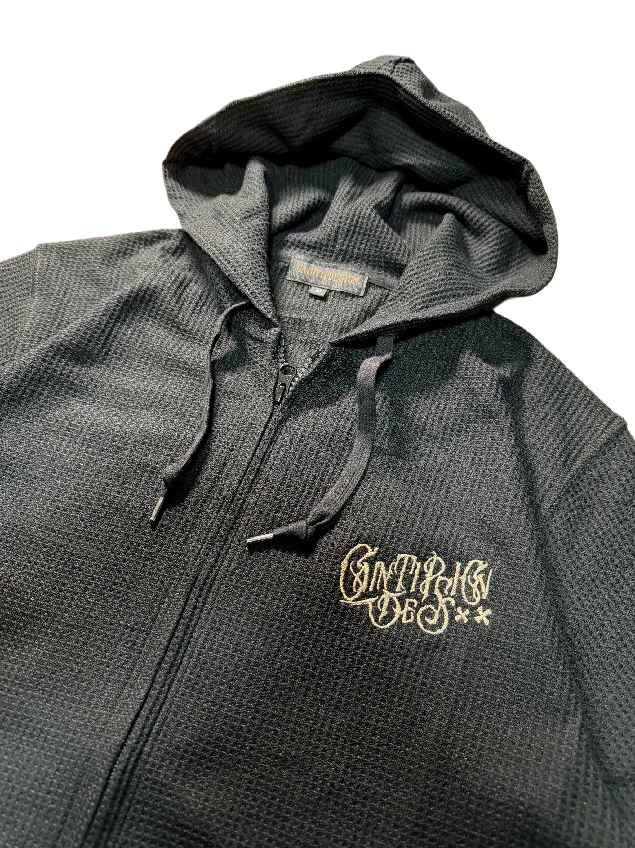胸にはGain Tip Designの定番ロゴ、背中にはブランドを象徴するスリークロス刺繍を配置。