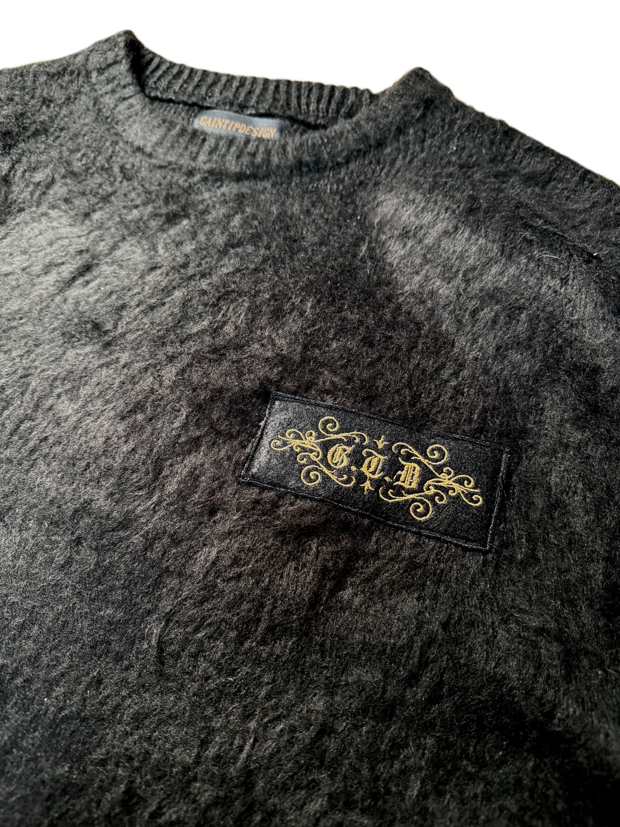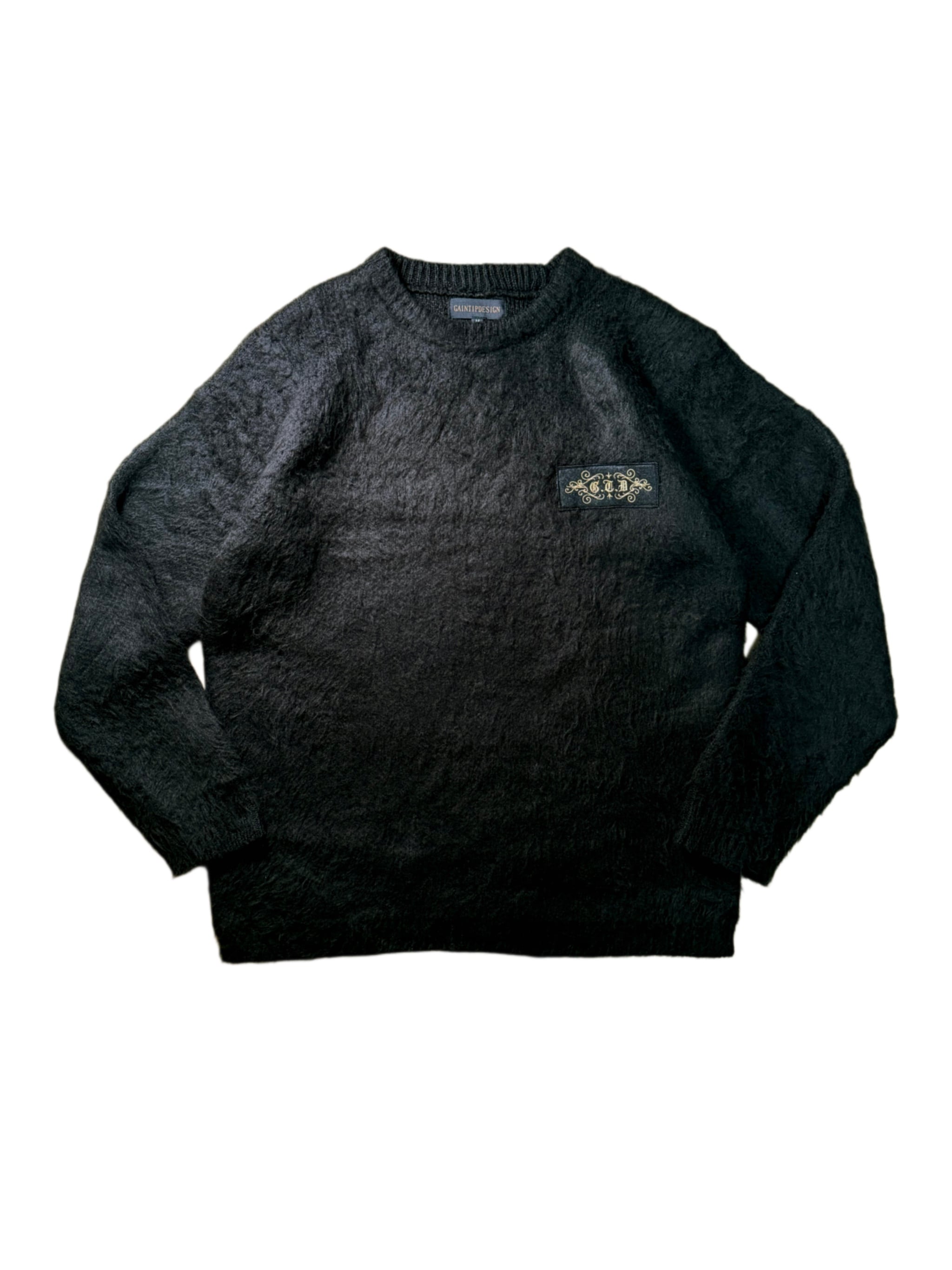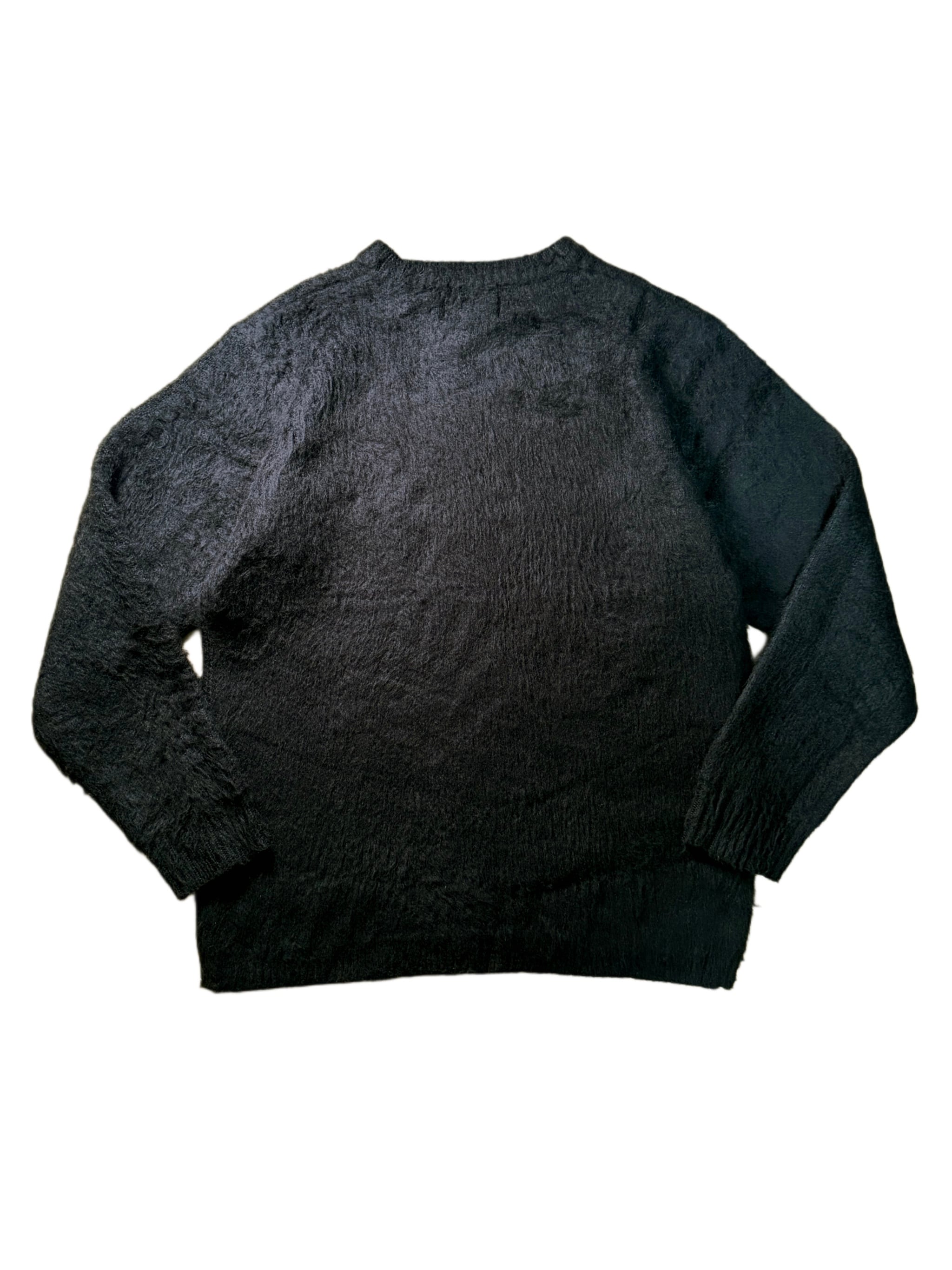 A crewneck sweater made from 100% nylon, featuring a soft, mohair-like texture.