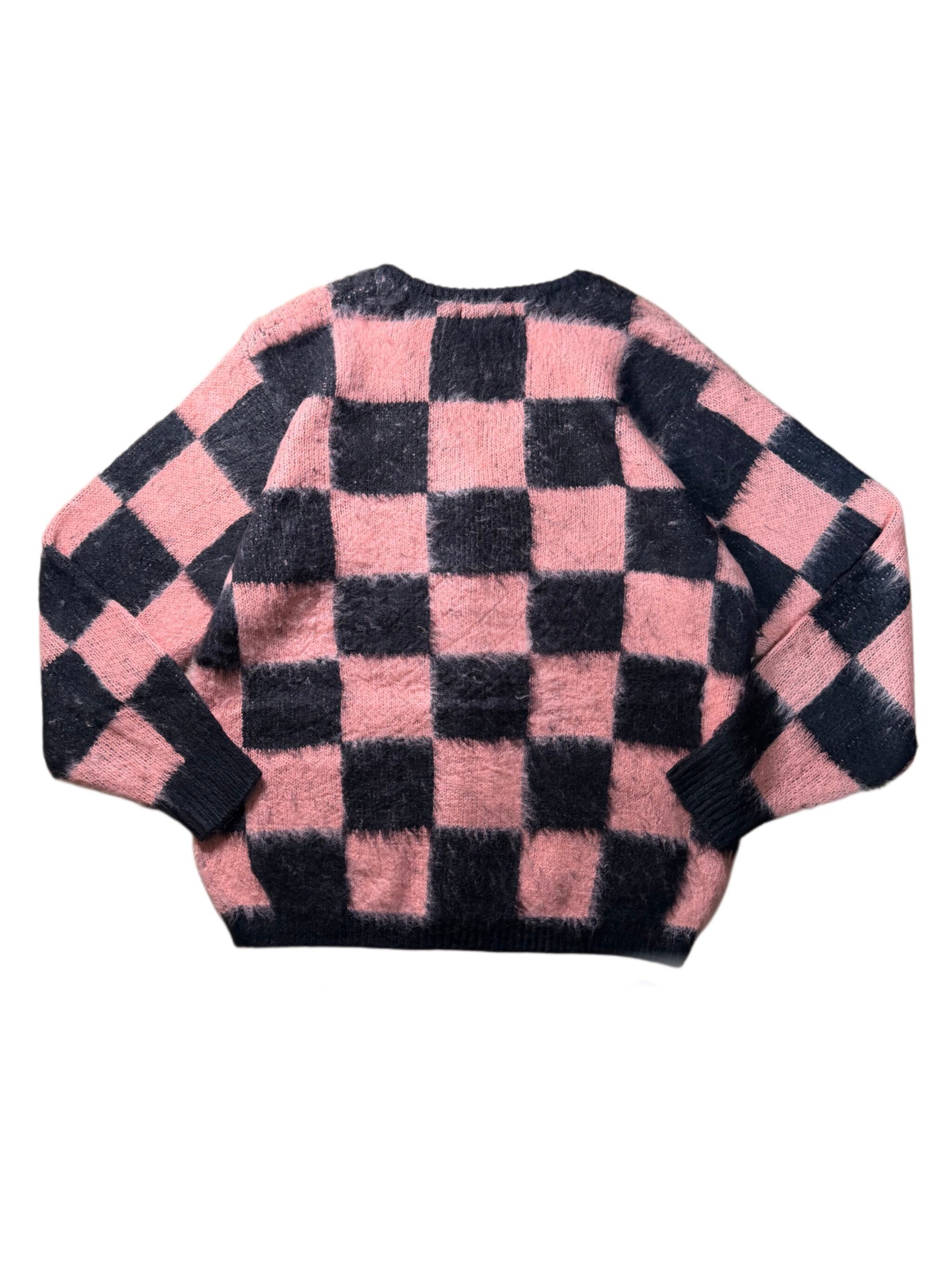This cardigan is crafted from 100% acrylic yarn, offering a mohair-like brushed texture combined with a lightweight feel.