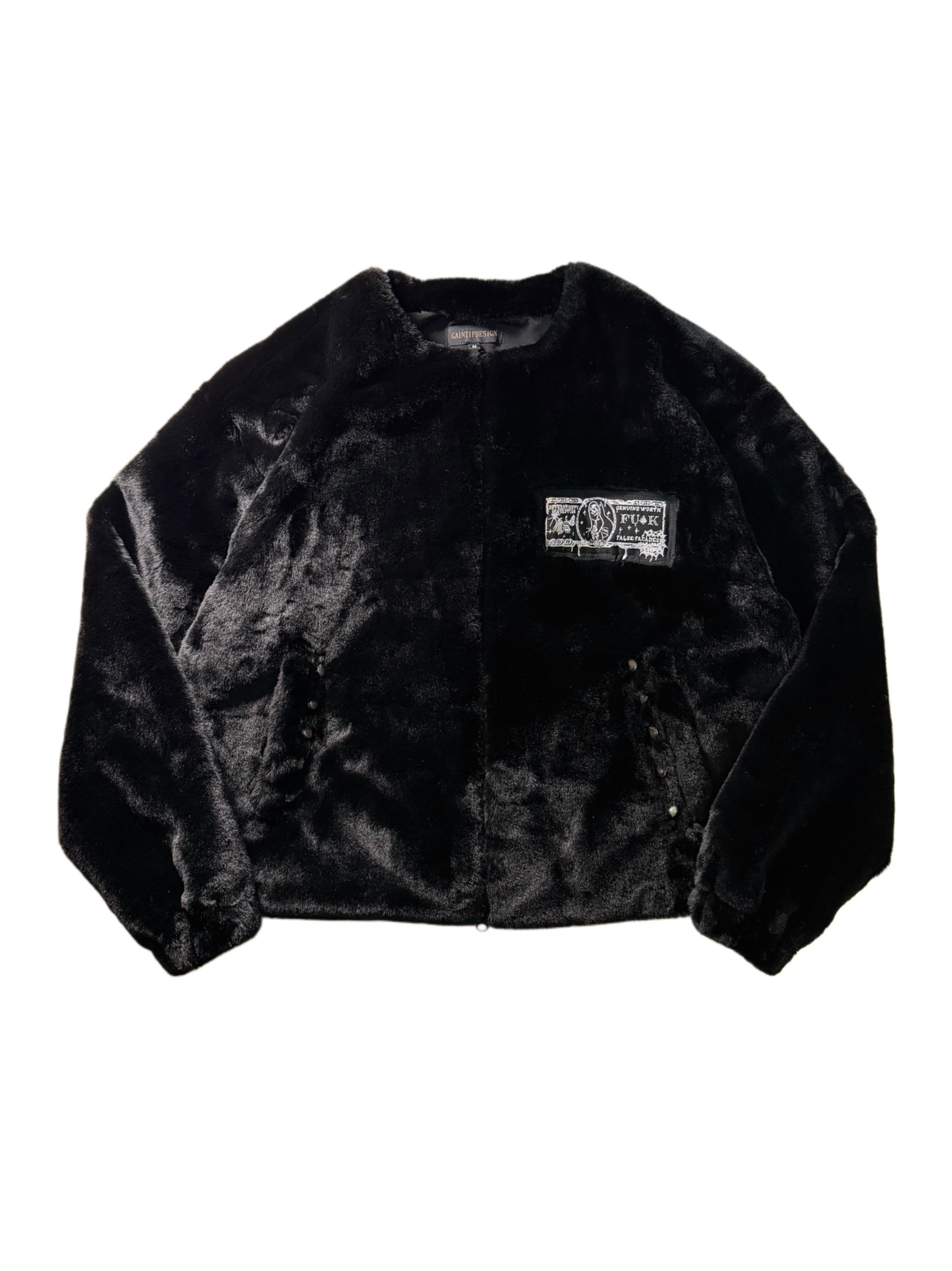 強い光沢を放つフェイクファーを使用し、動くたびに陰影が生まれることで、無骨さと艶っぽさが同時に立ち上がるブルゾンです。