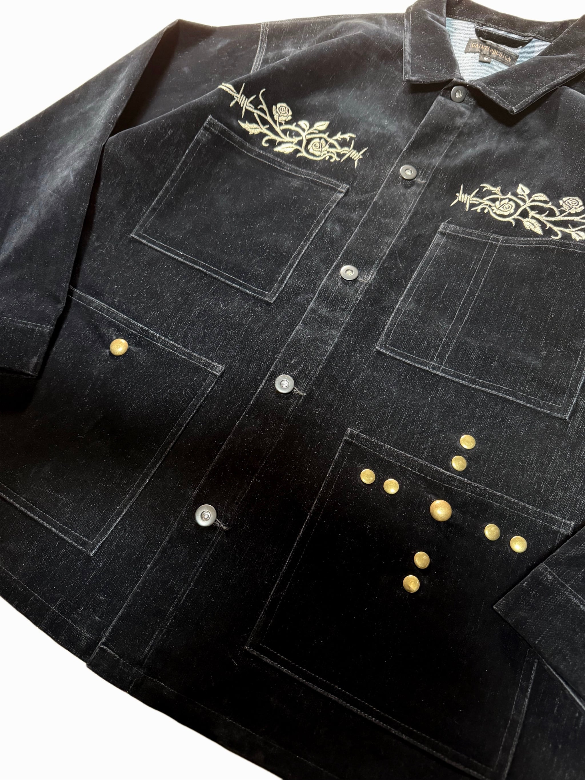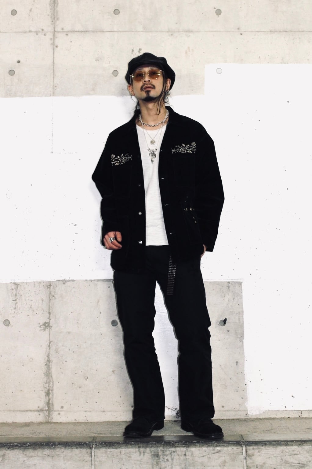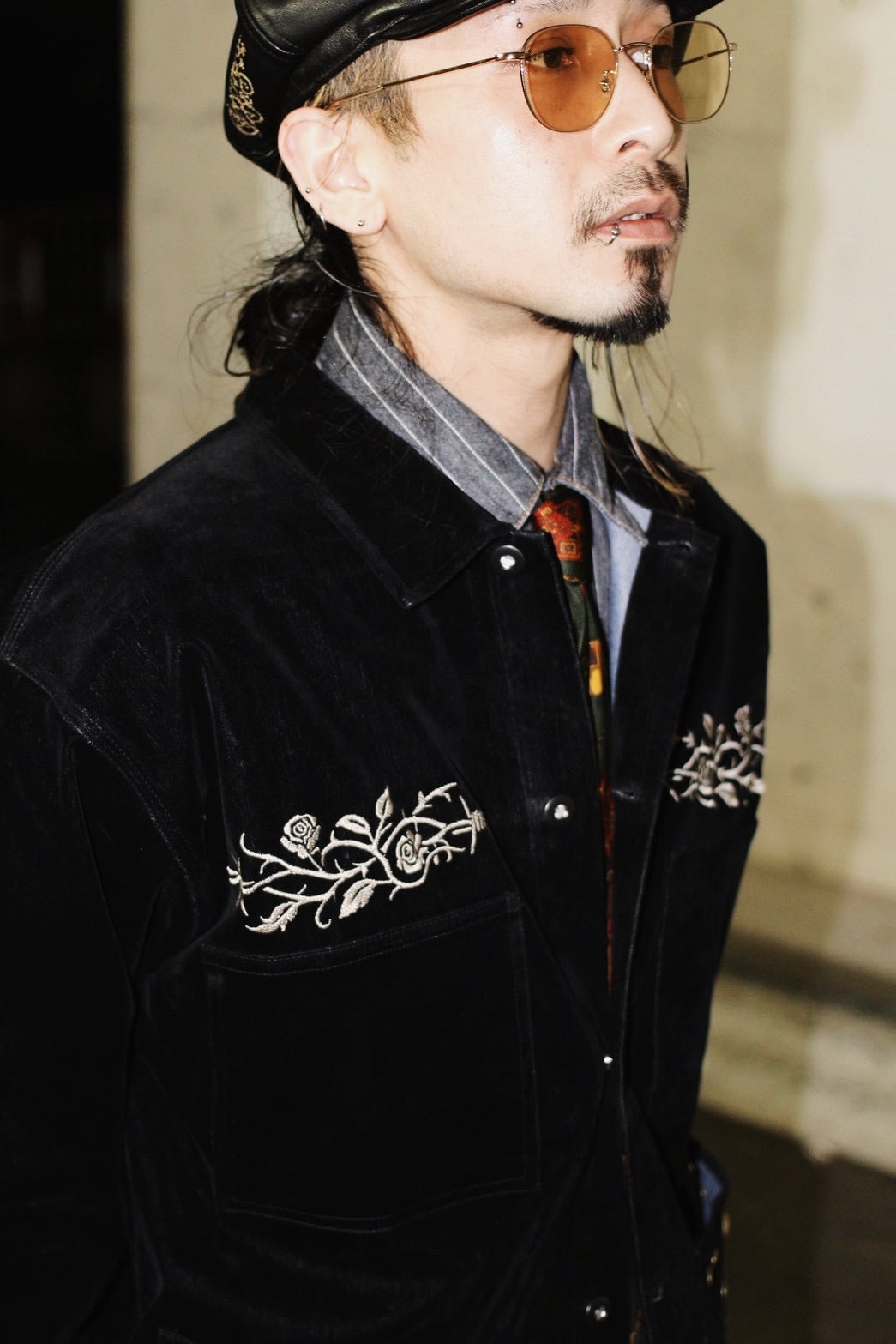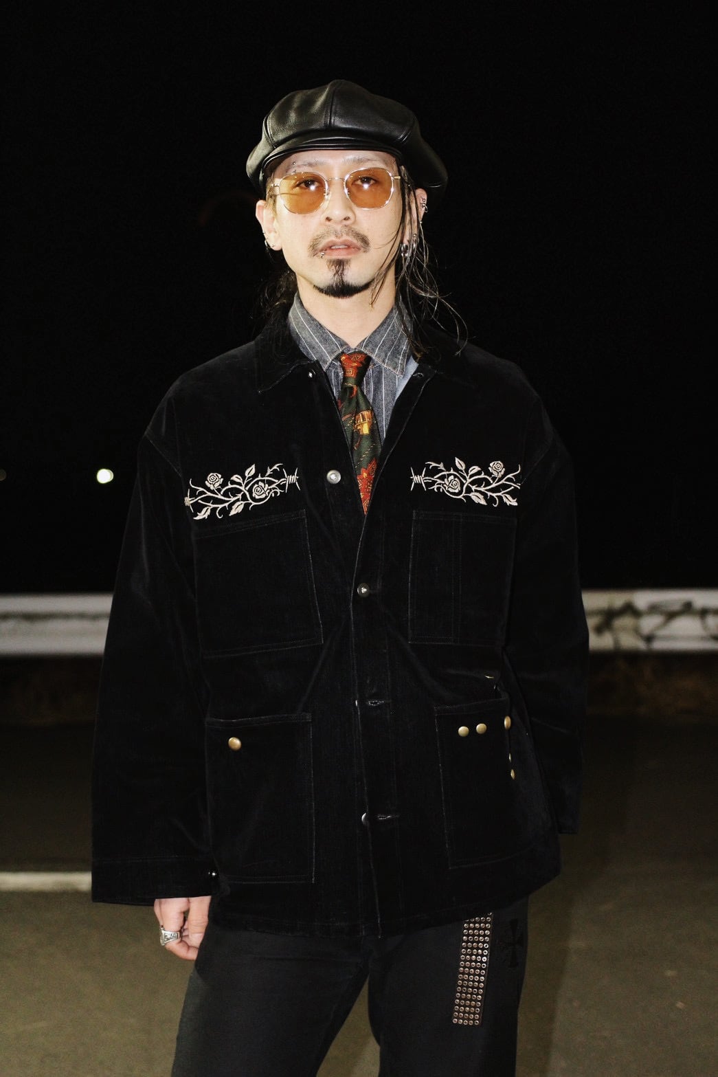 そこへ胸元の刺繍と腹部に配したスタッズを加えることで、視線の流れと奥行きを設計し、フロント全体に視覚的な快楽と緊張感を与えています。