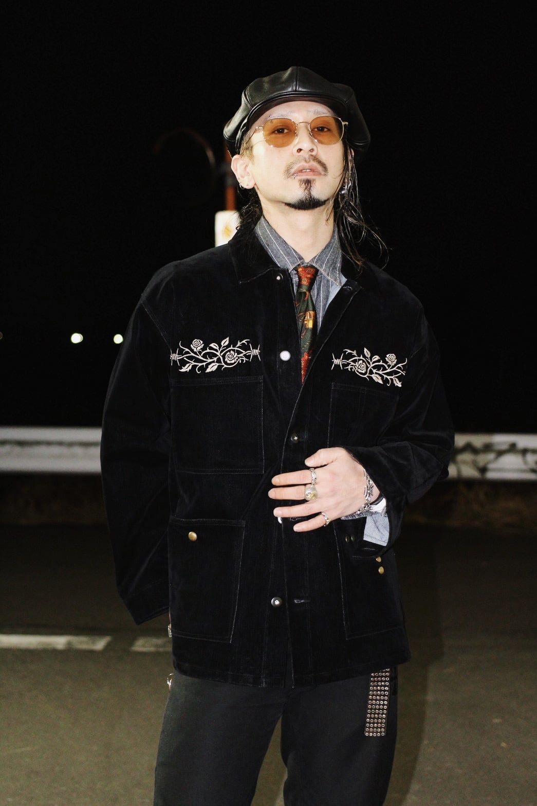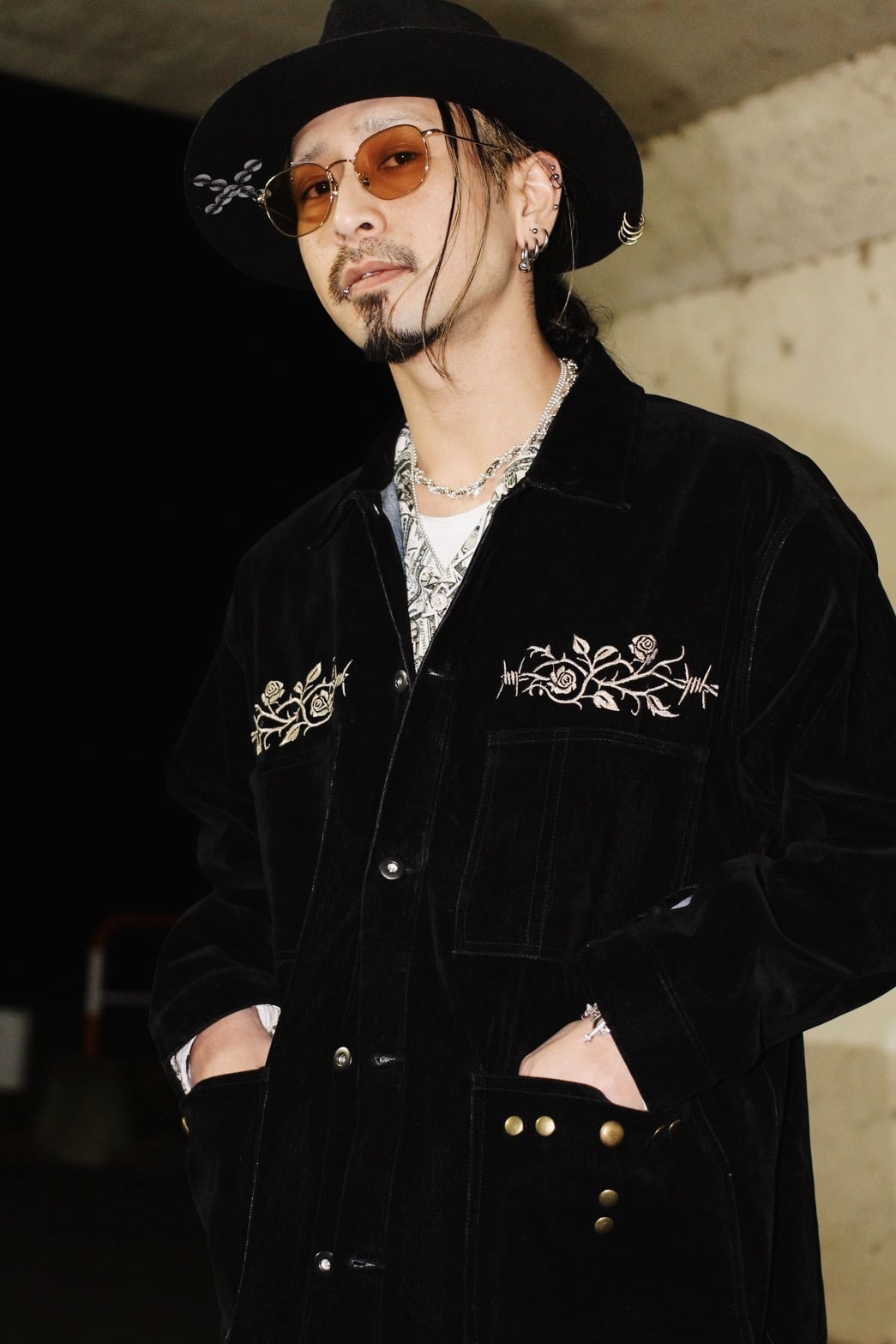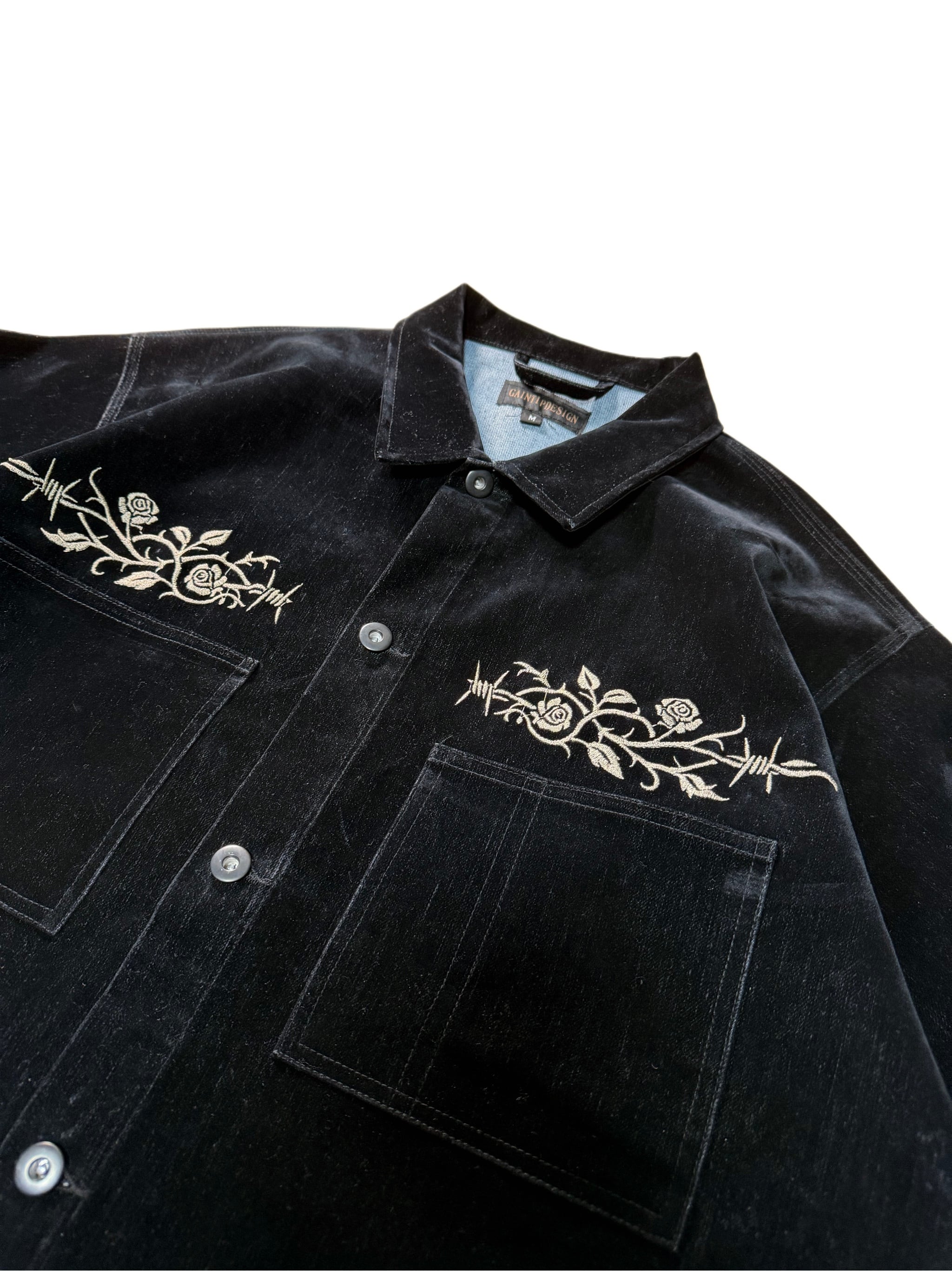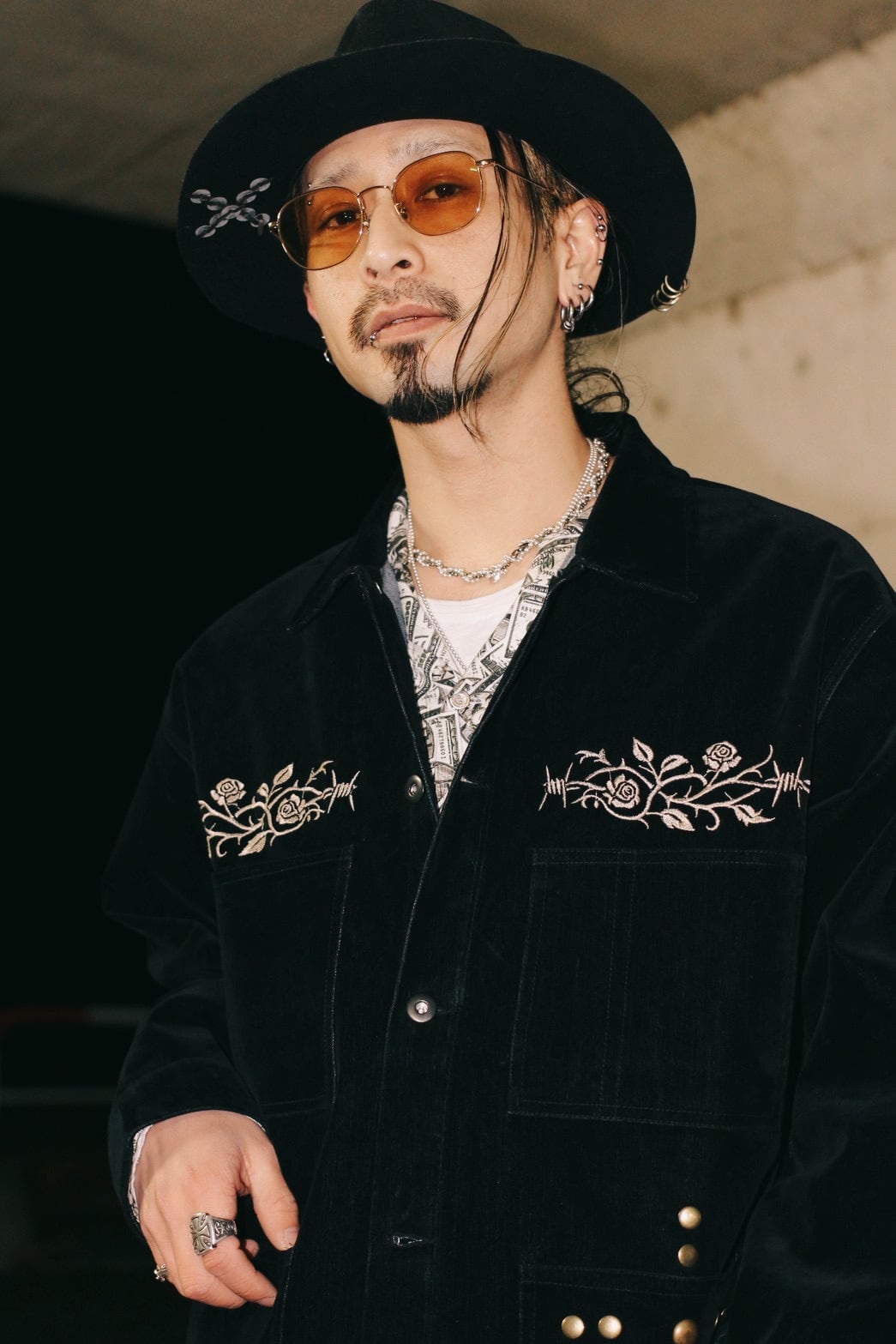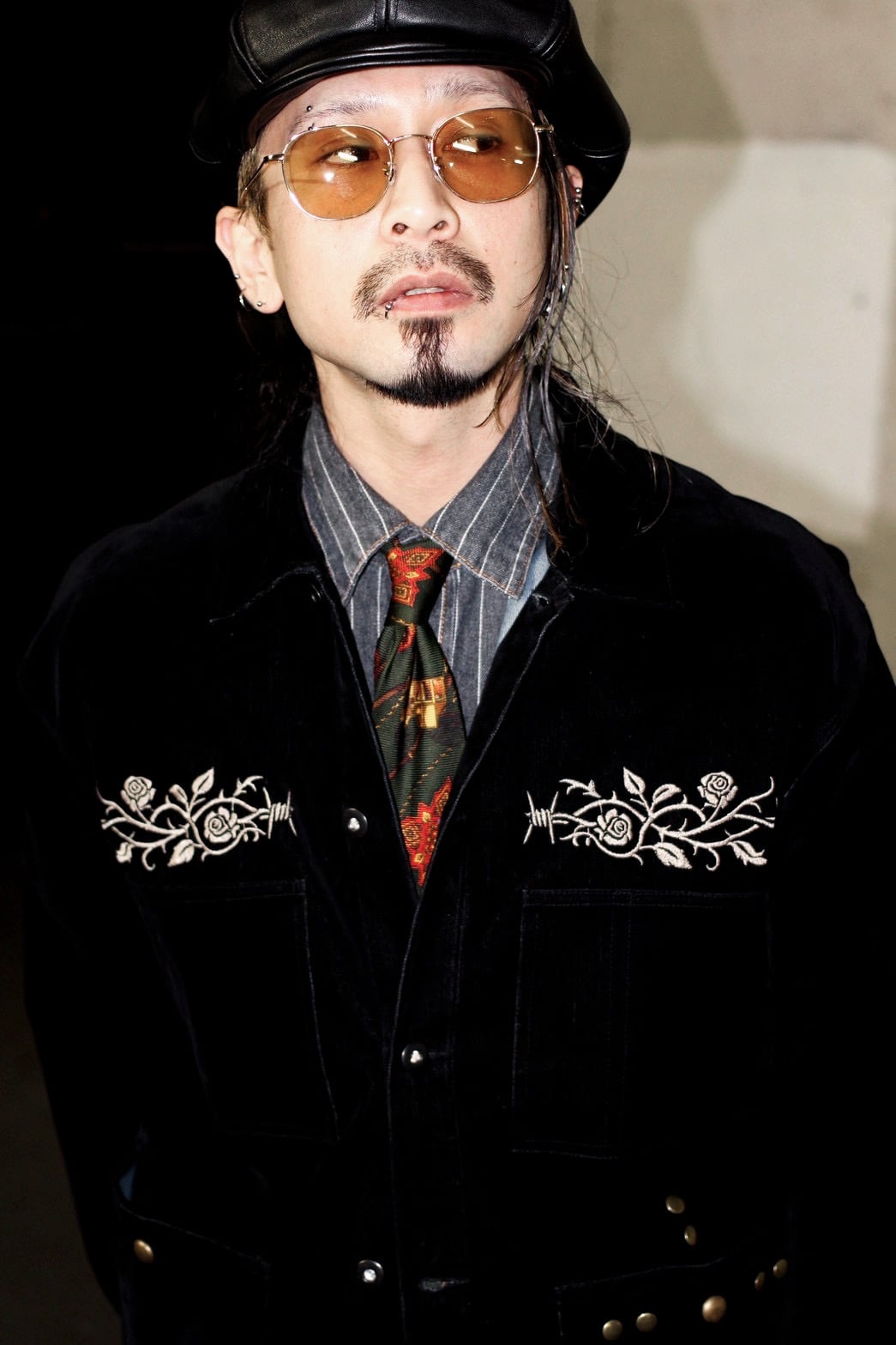 そこへ胸元の刺繍と腹部に配したスタッズを加えることで、視線の流れと奥行きを設計し、フロント全体に視覚的な快楽と緊張感を与えています。
