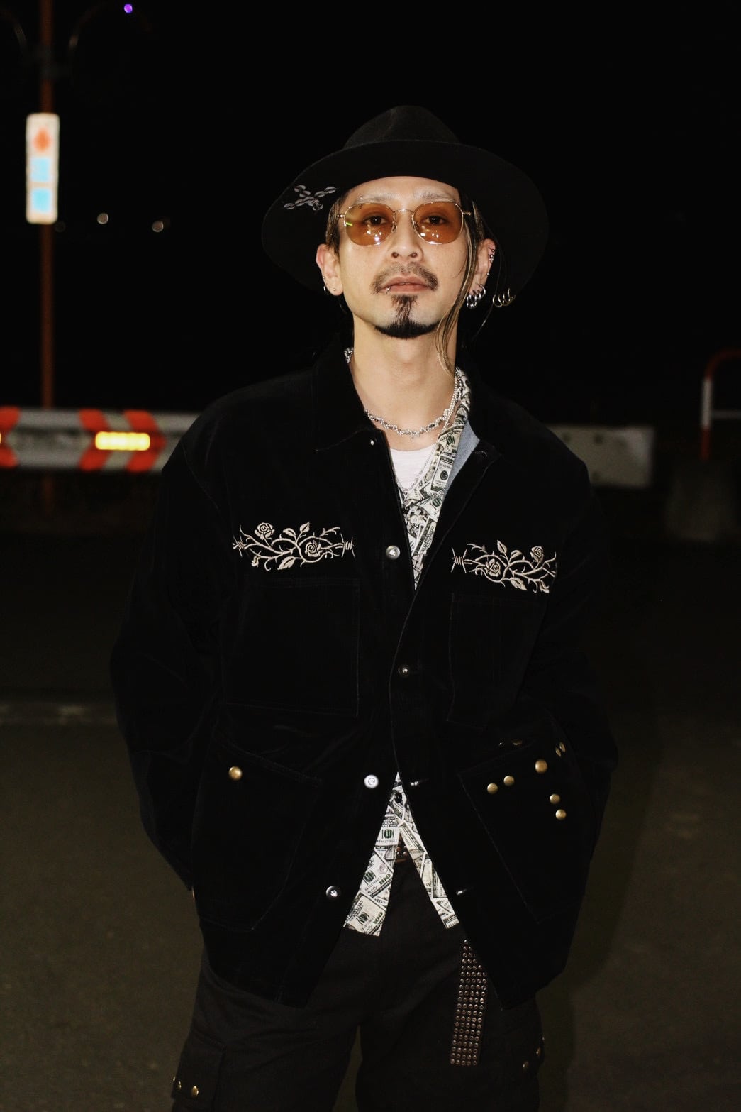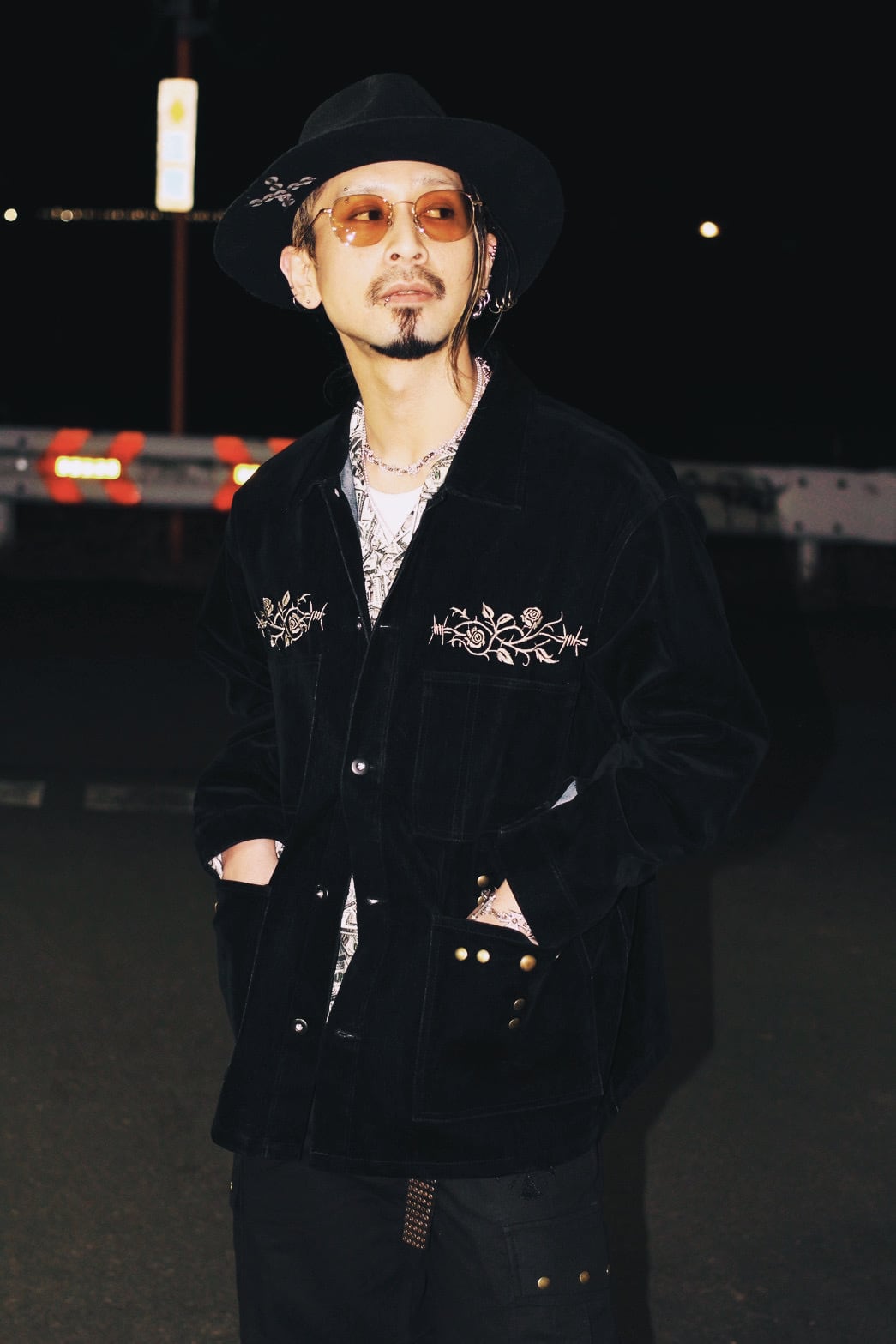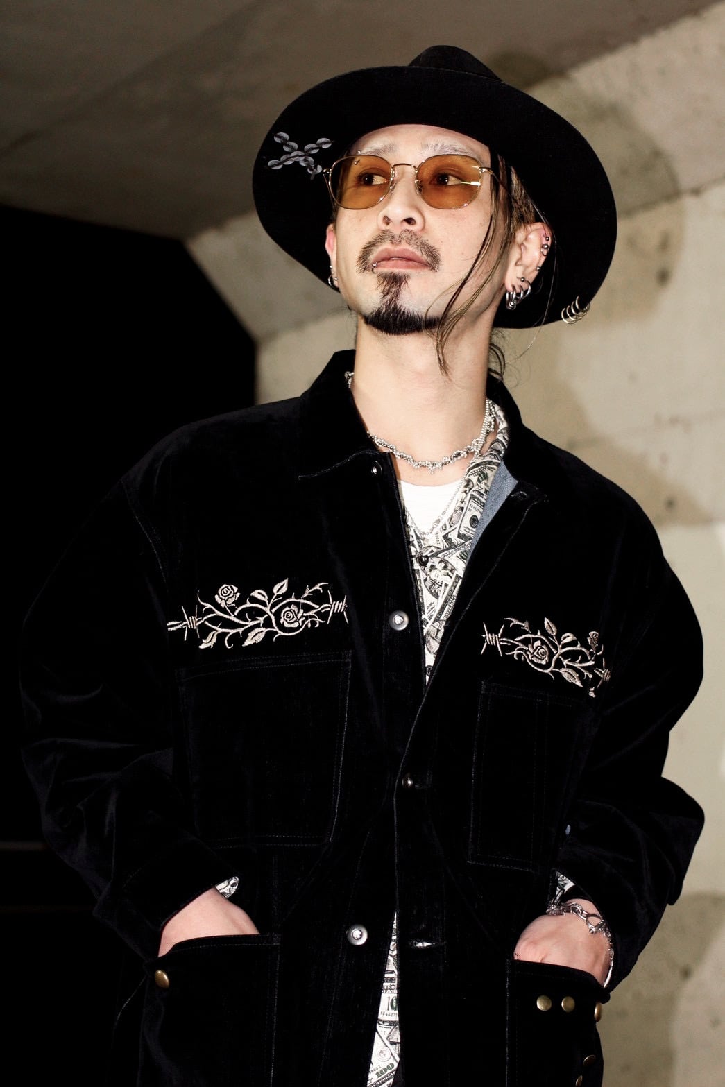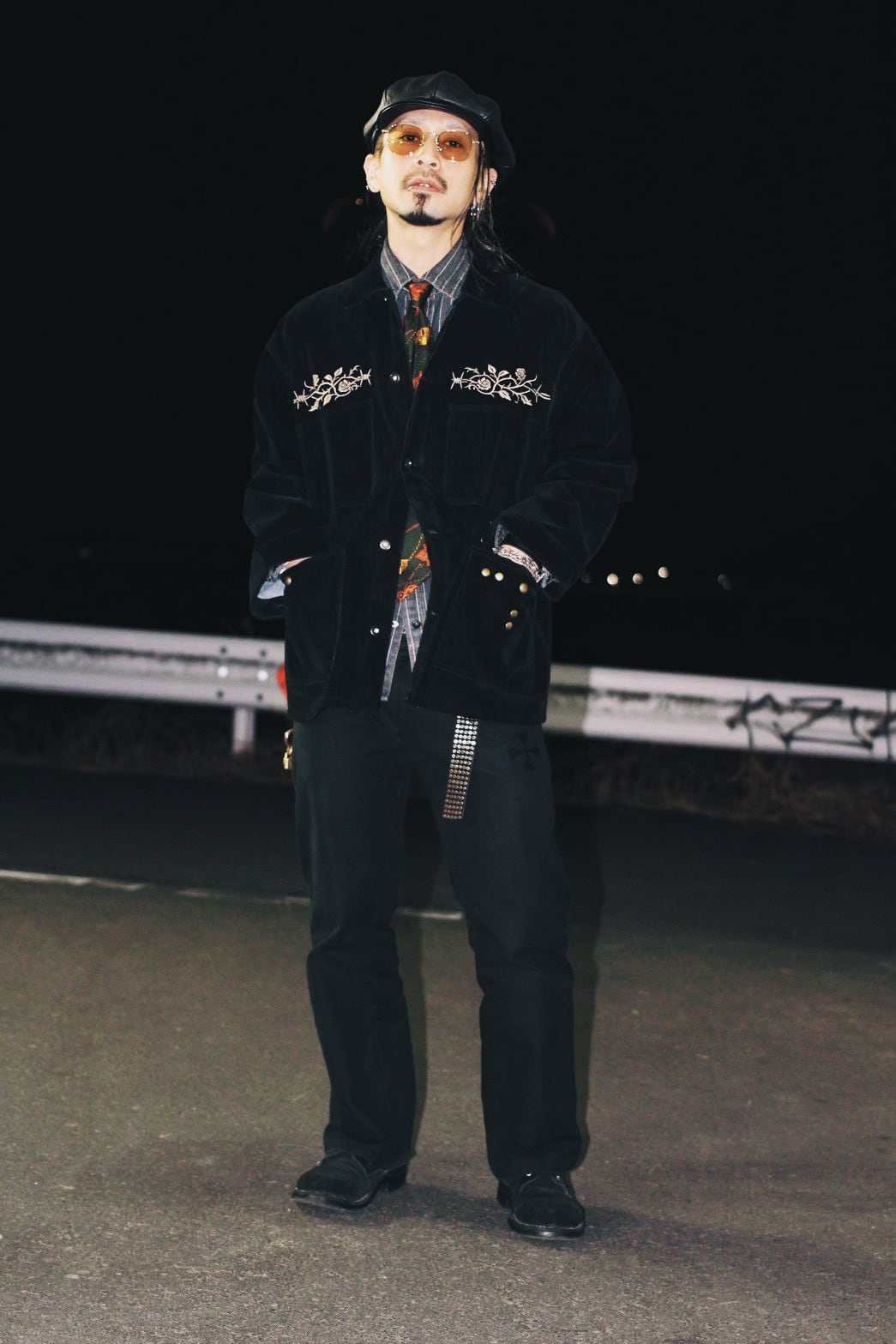そこへ胸元の刺繍と腹部に配したスタッズを加えることで、視線の流れと奥行きを設計し、フロント全体に視覚的な快楽と緊張感を与えています。