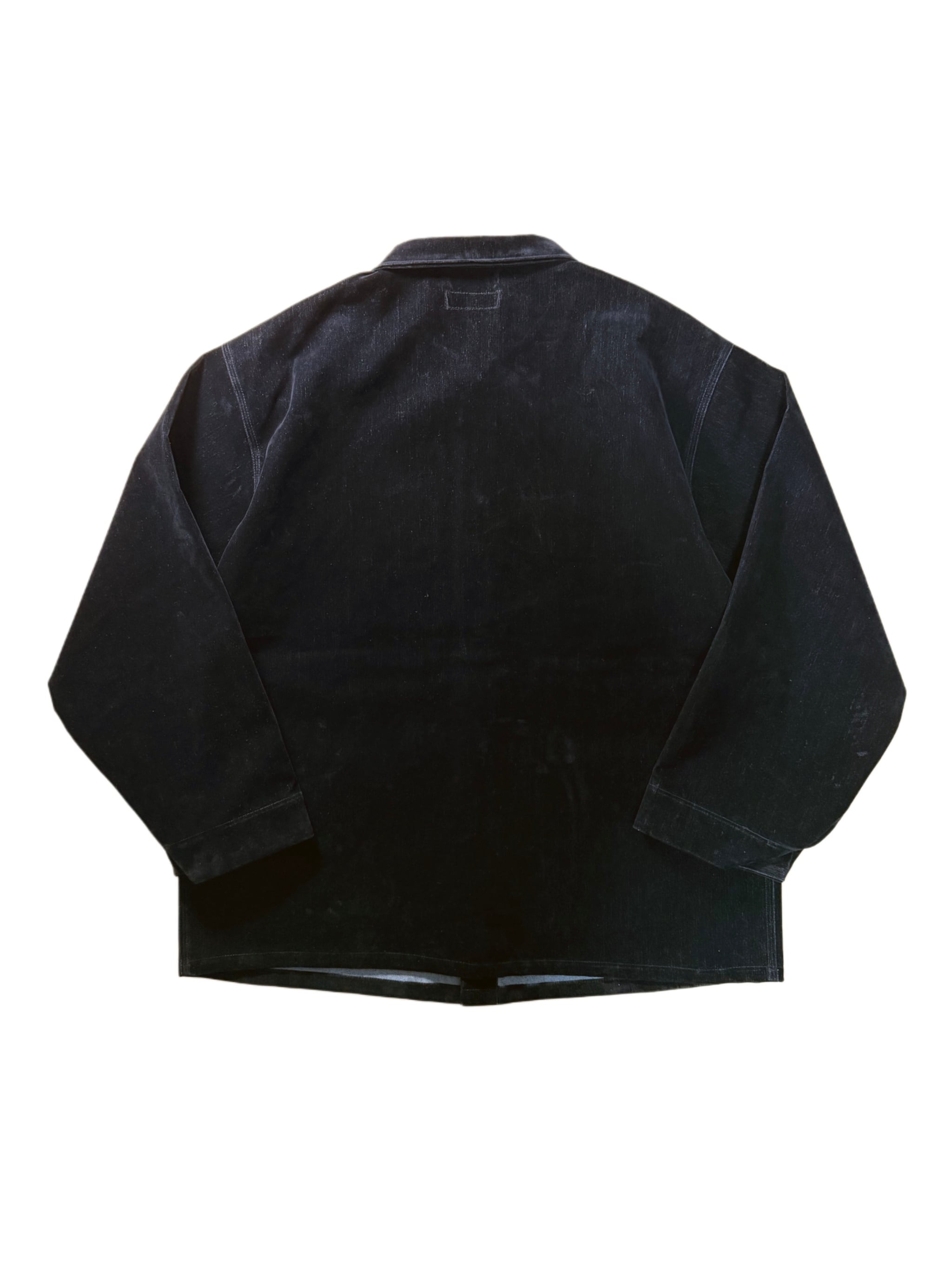 10oz程度のブラックデニムをベースに、表地全体へフロッキープリント加工を施したカバーオール。