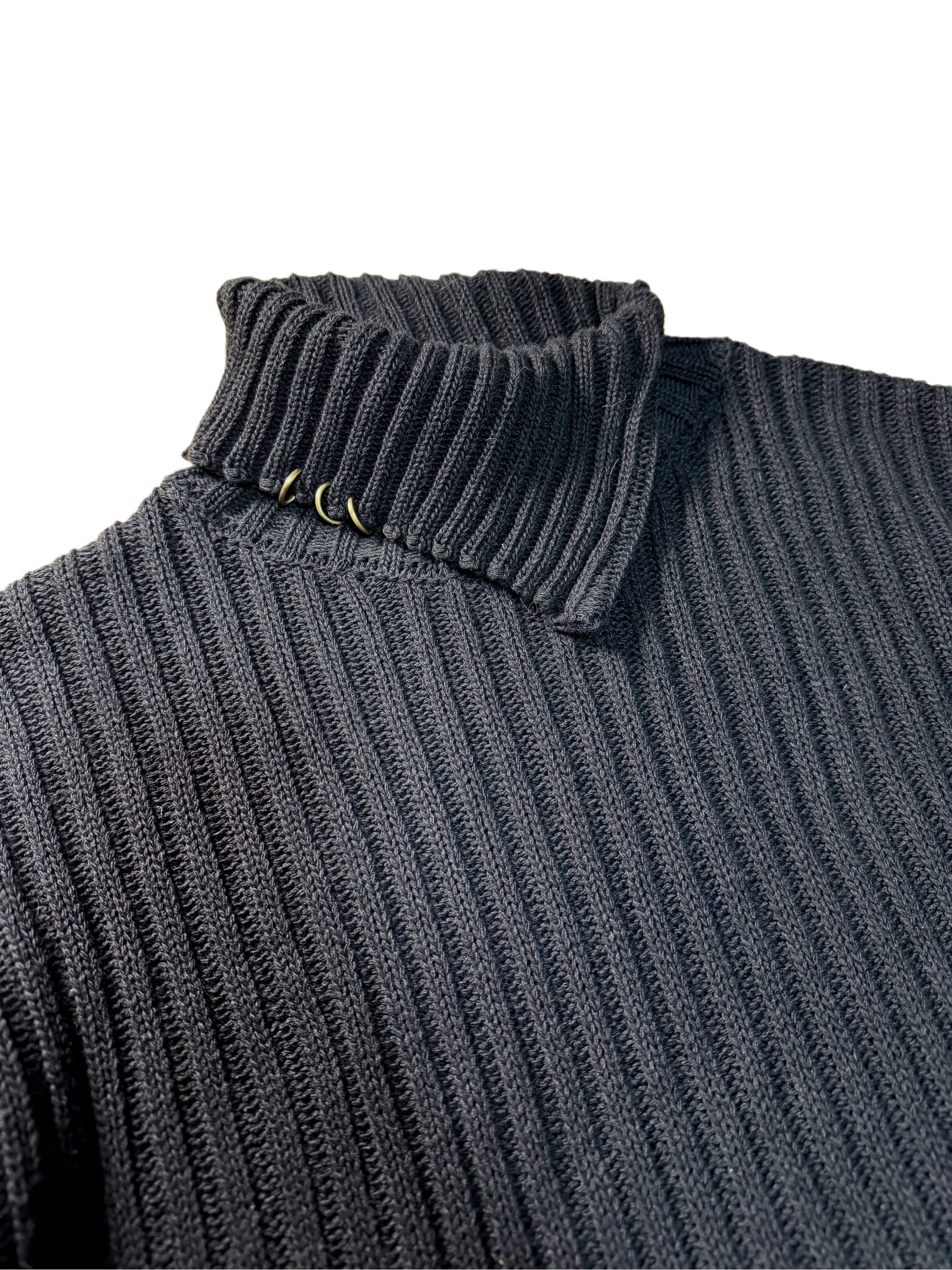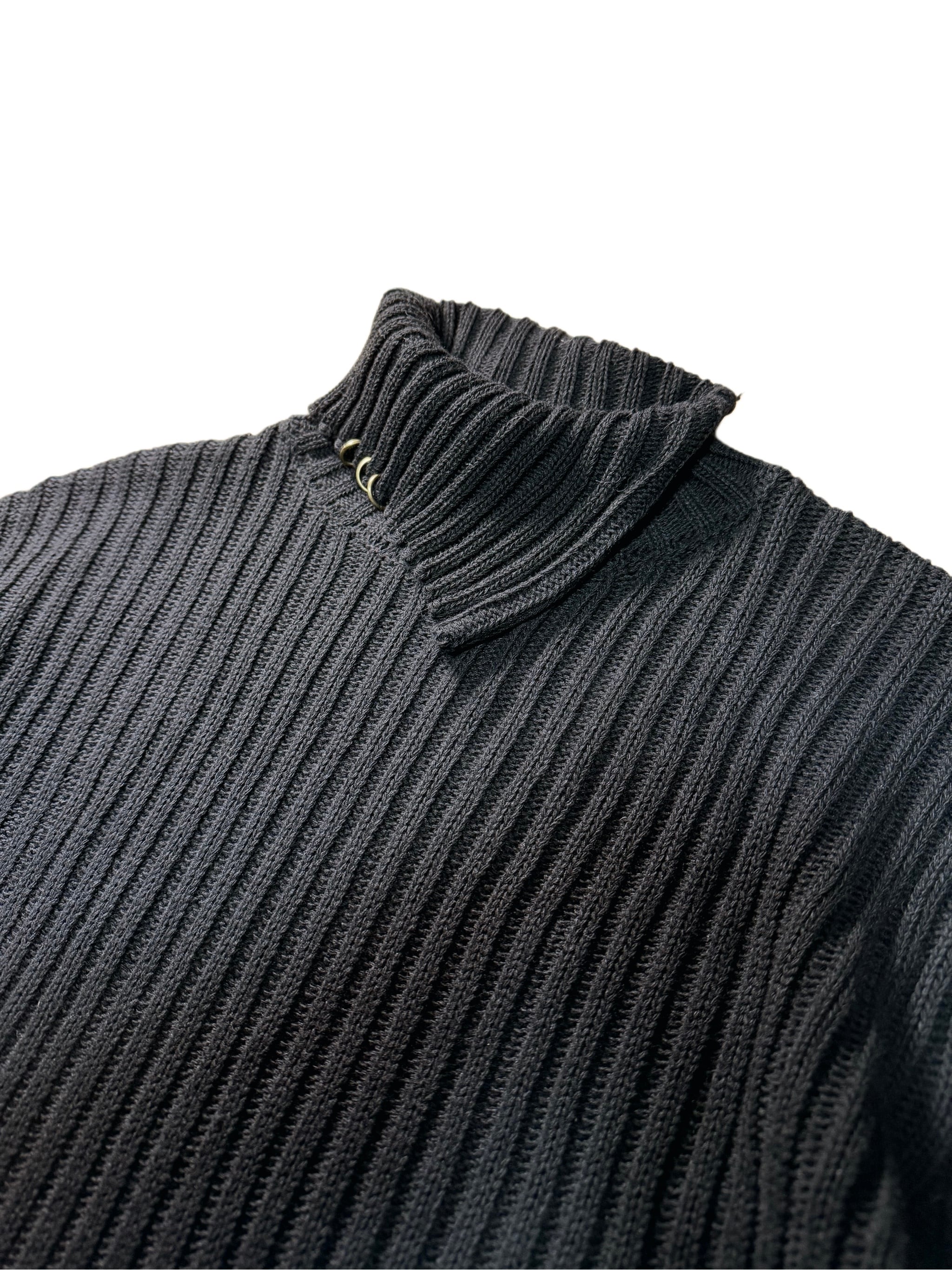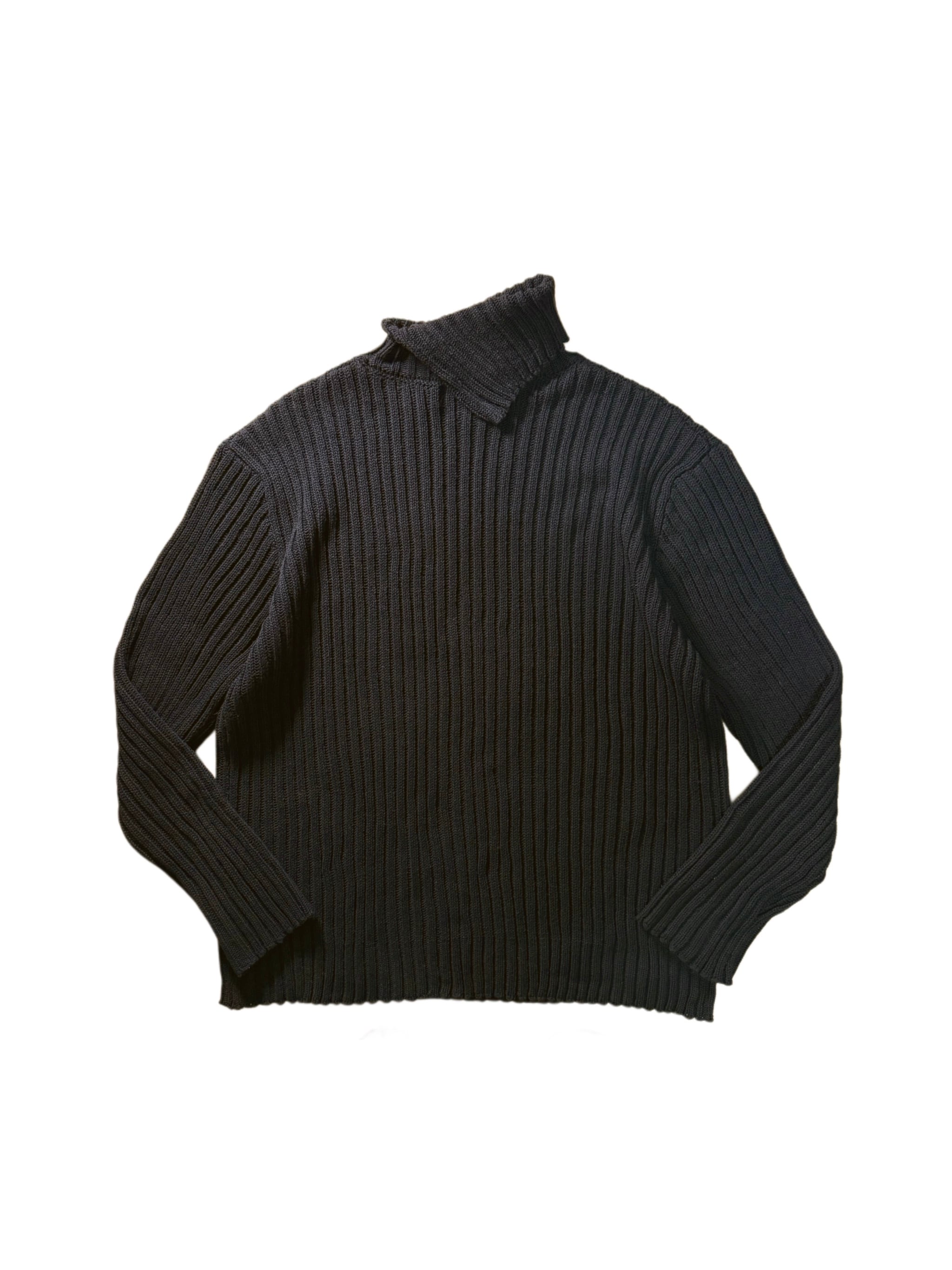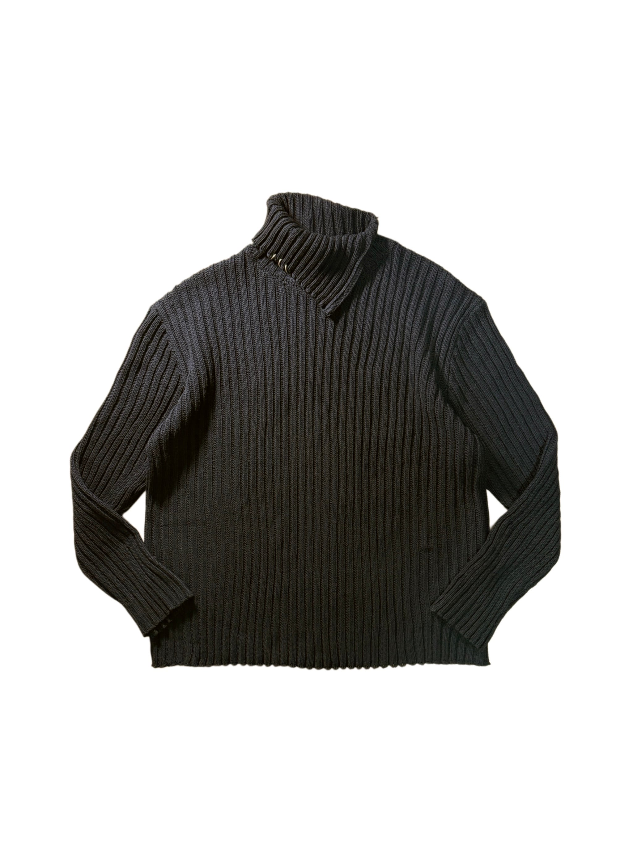 太い畝が際立つニット生地を使用した、アシンメトリータートルネックニット。