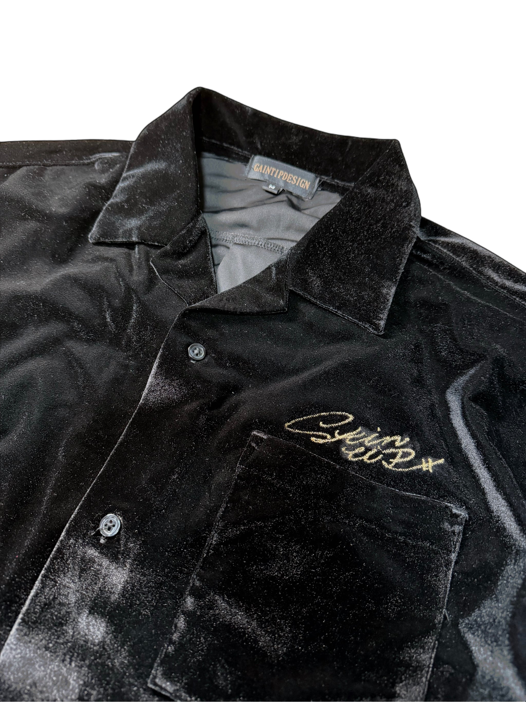 光沢の強いベロア生地を使用した開襟シャツ。