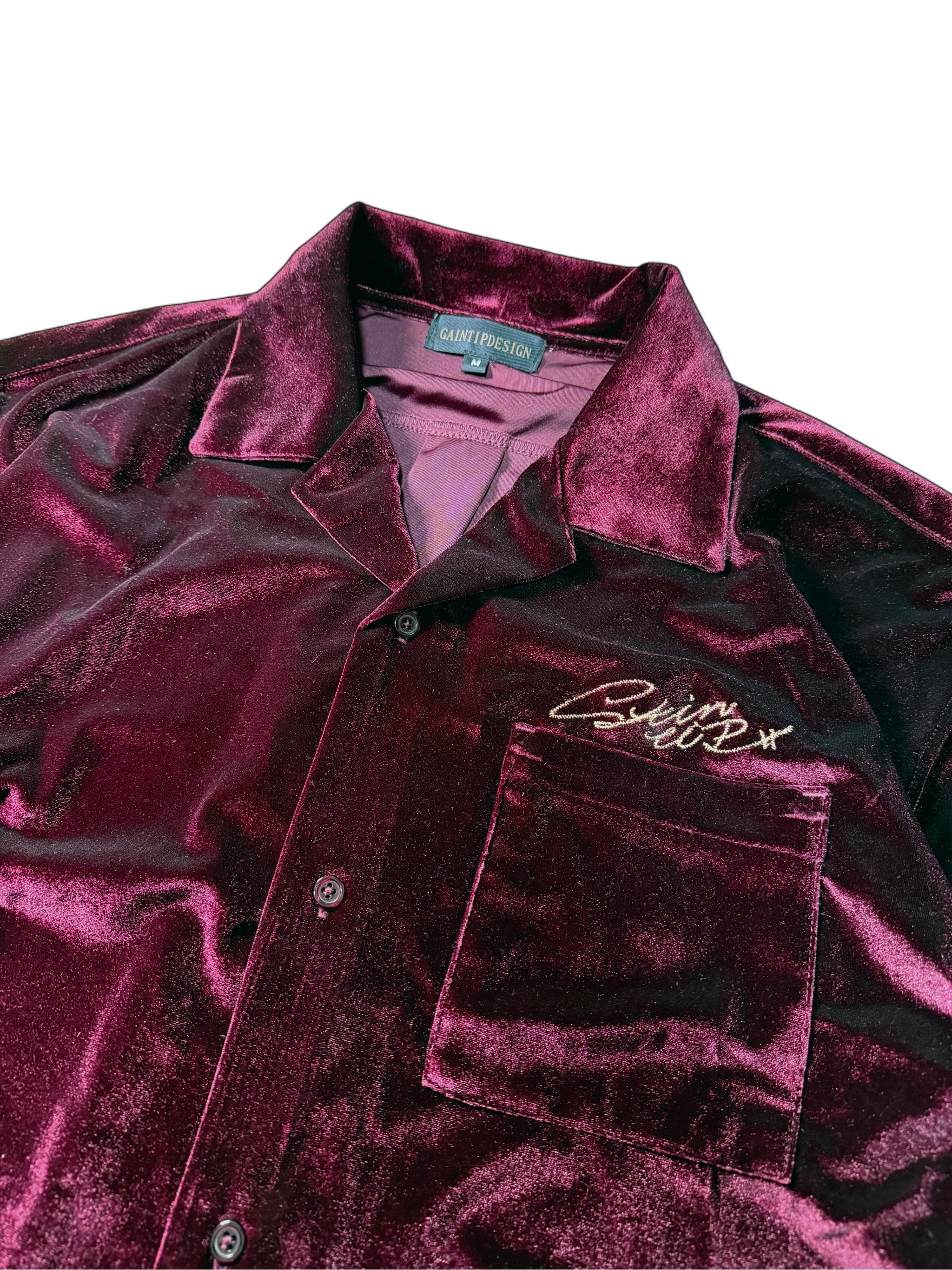An open-collar shirt crafted from richly lustrous velour fabric.