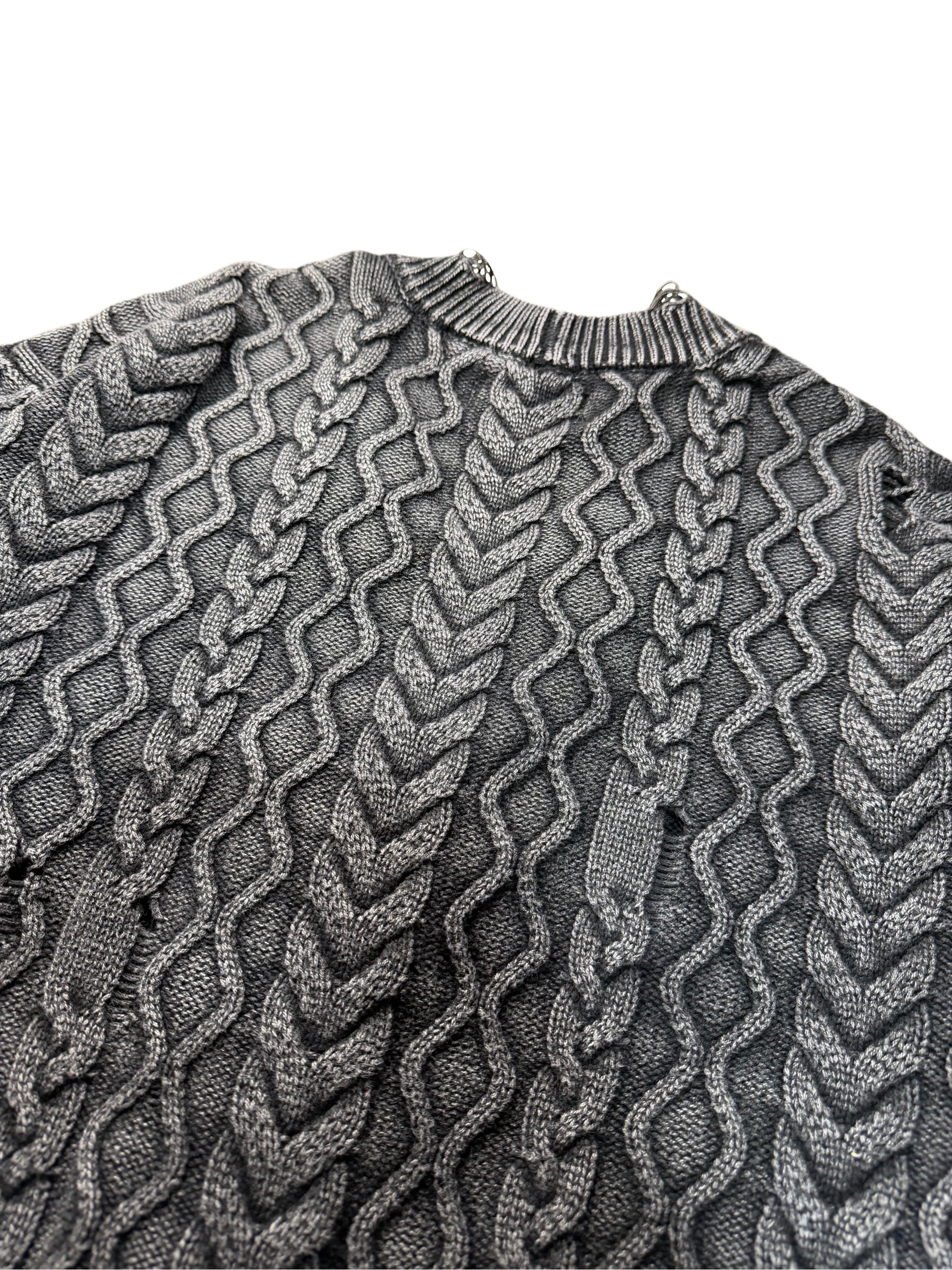 A cardigan crafted from soft cotton cable knit, finished with layered wash and damage processing.