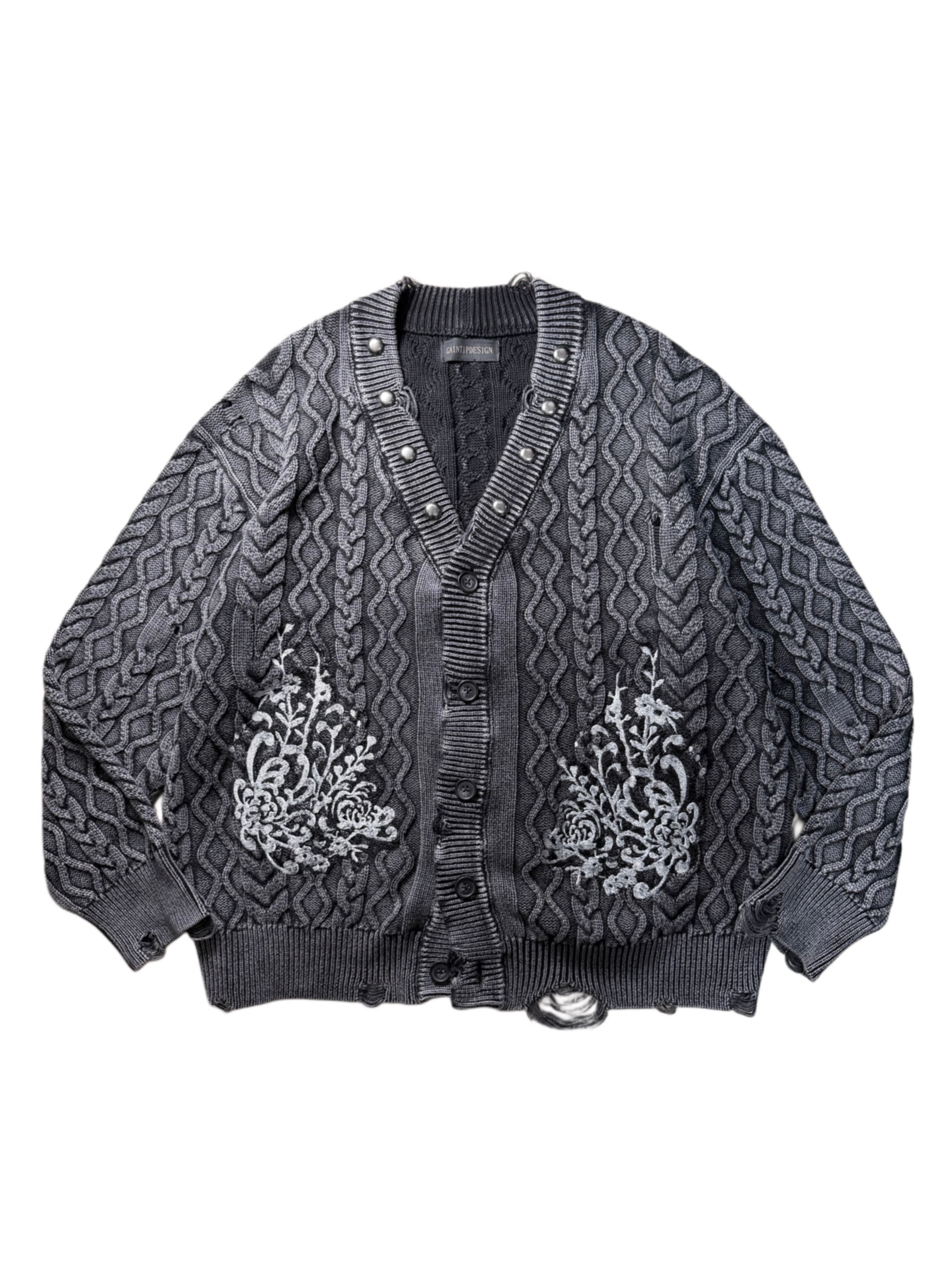 コットンの柔らかさを持つケーブルニットに、ウォッシュとダメージ加工を重ねたカーディガン。