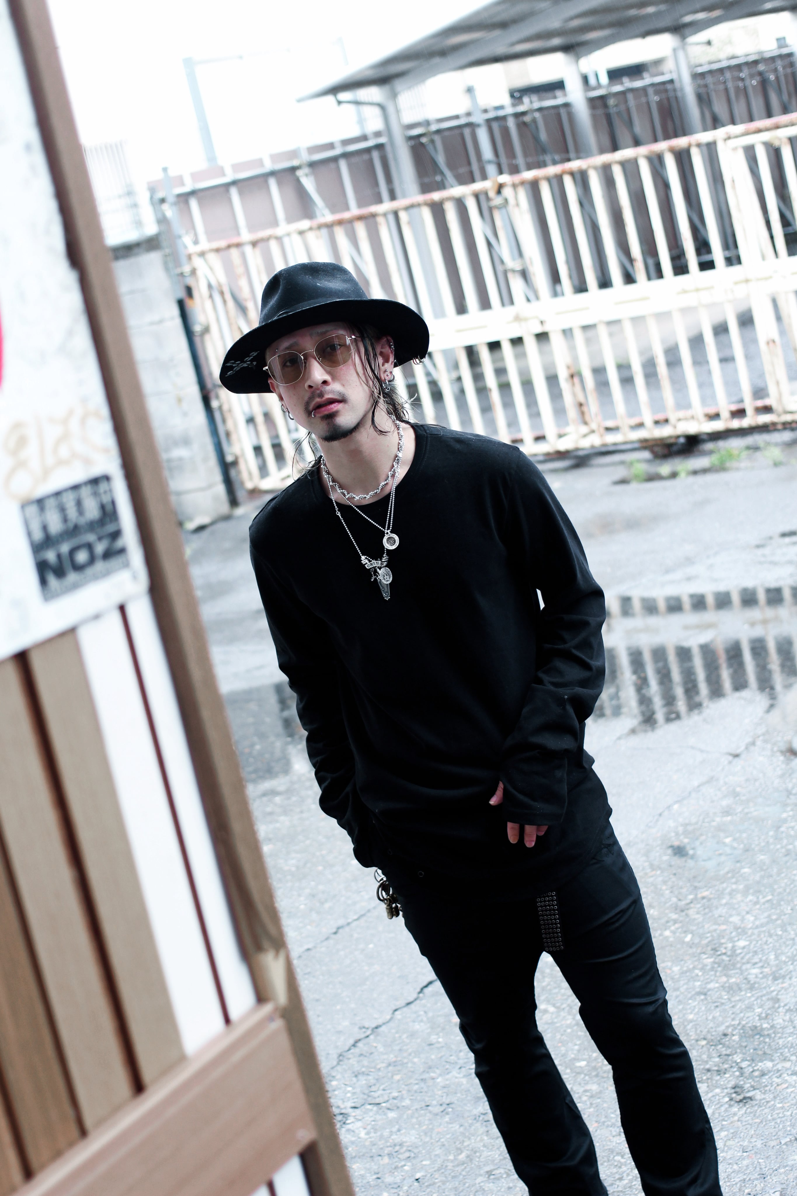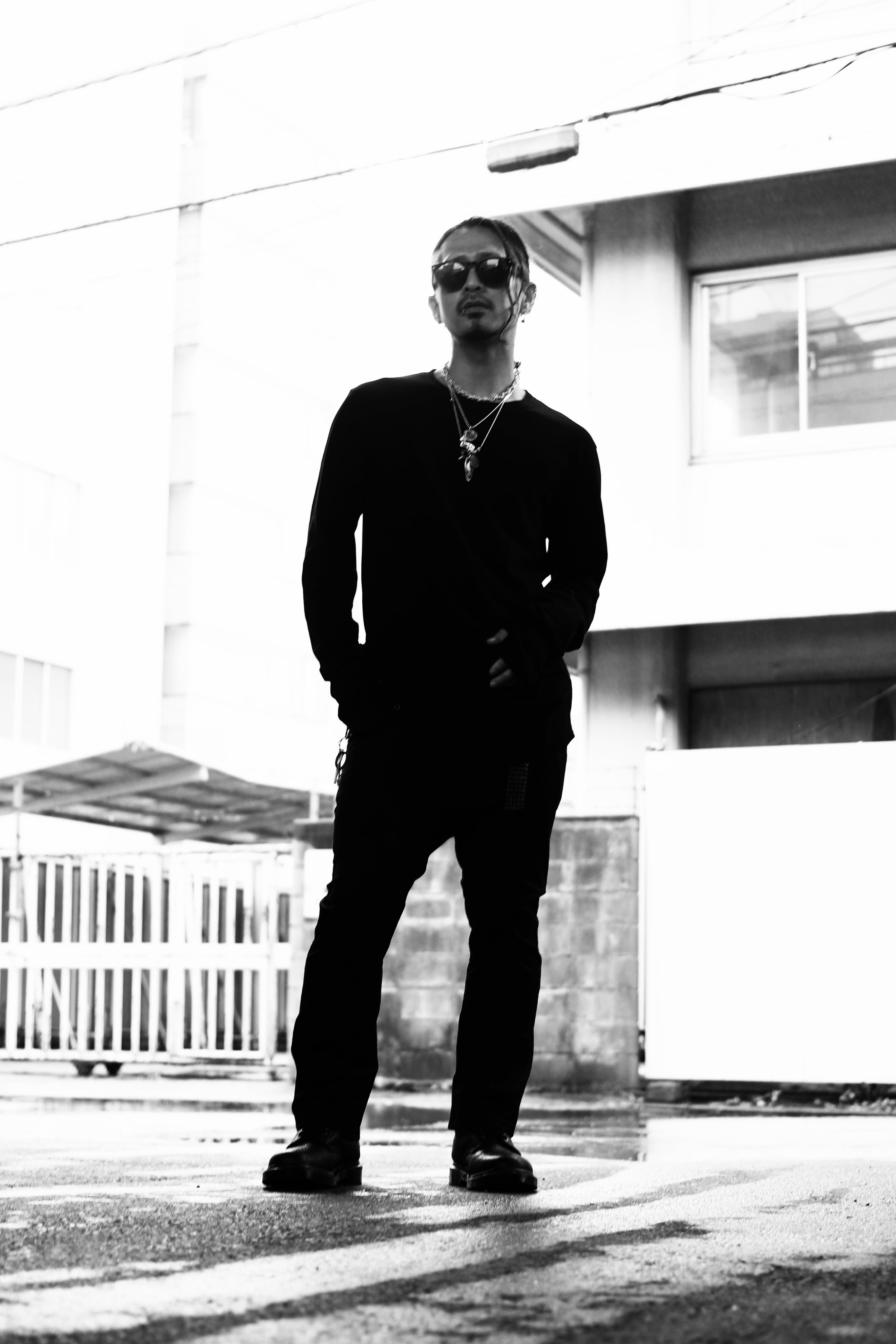サルエル特有のストリートなラフさに、光沢のある素材を掛け合わせることで、無骨さとエレガンスの中間に位置する独特な空気感を形成。
