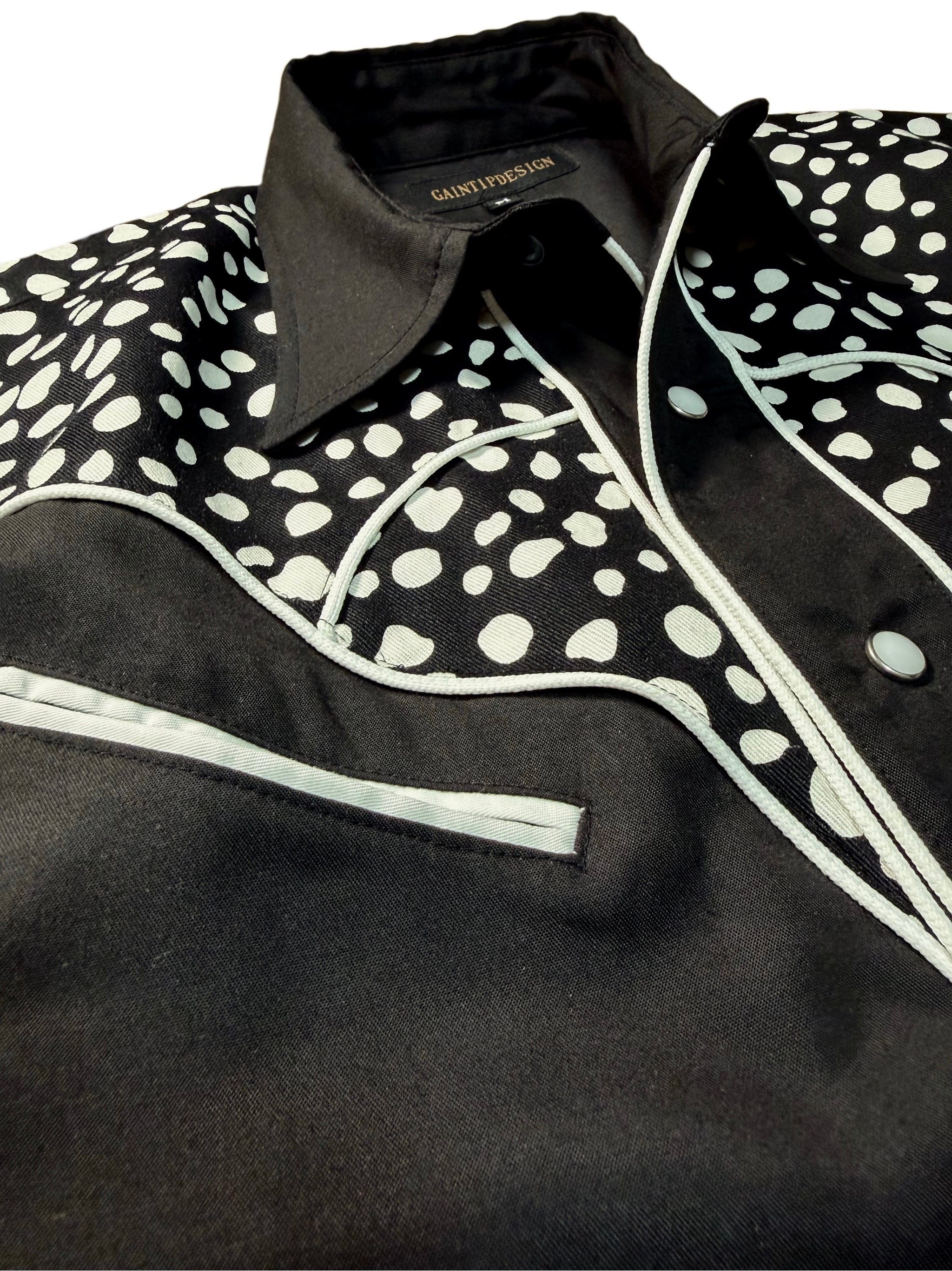 The defining feature lies in the extension of the traditional western panel design through the addition of piping. While conventional western yokes are constructed with straight lines and sharp angles, this piece layers smooth, curved lines into that structure.