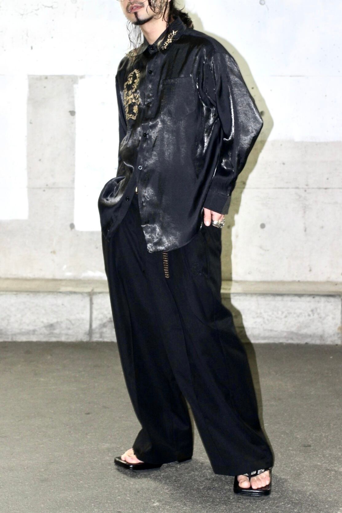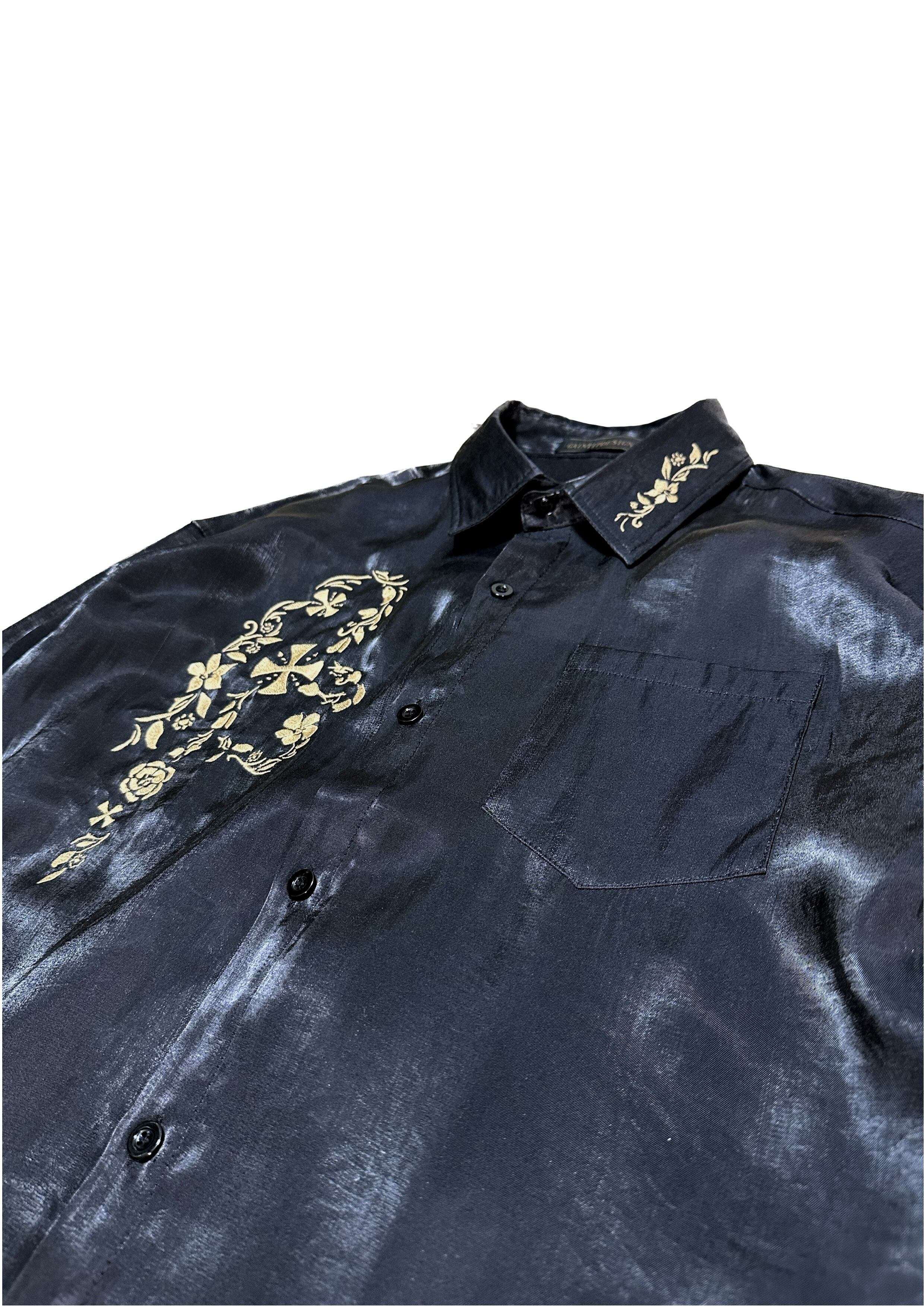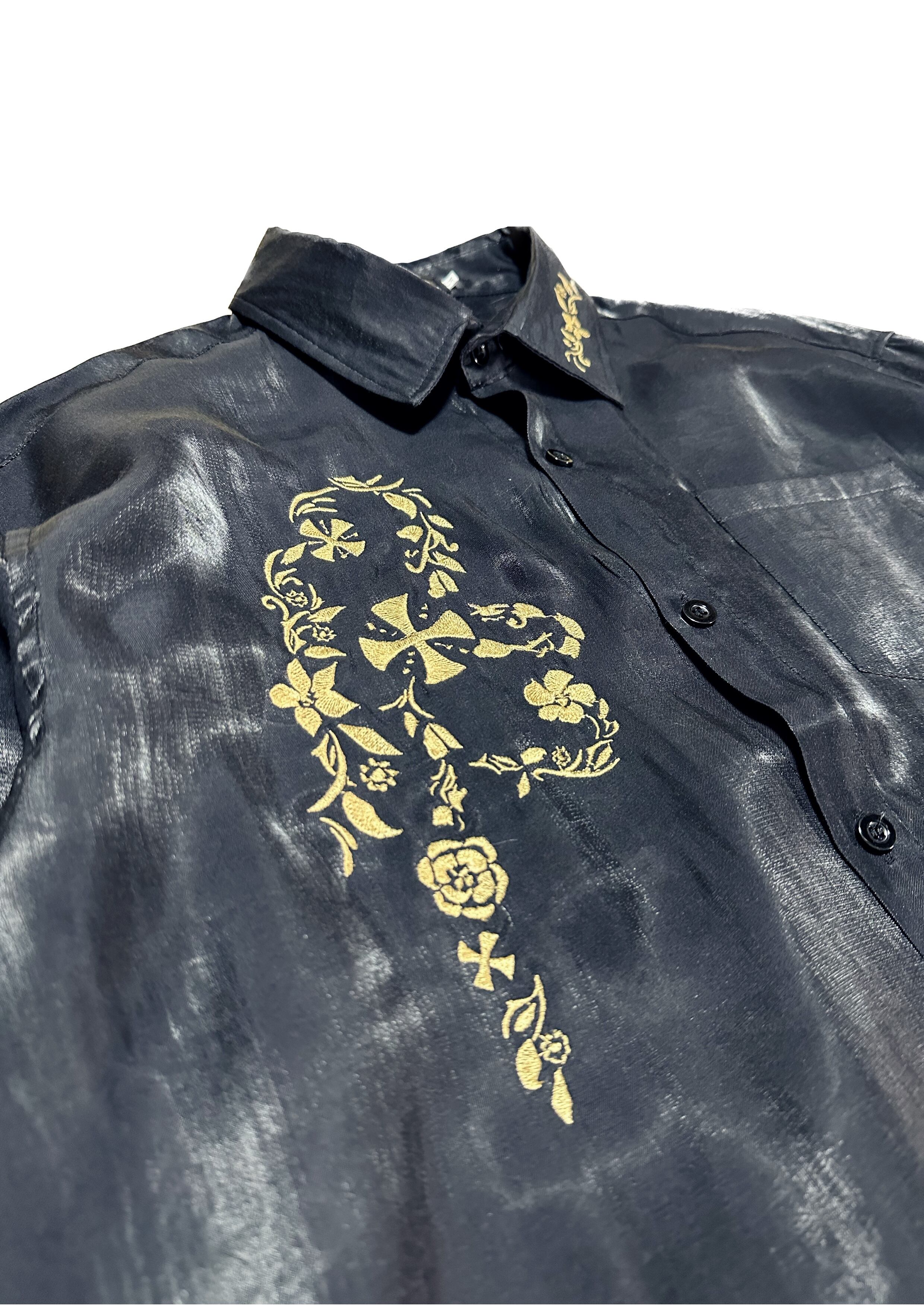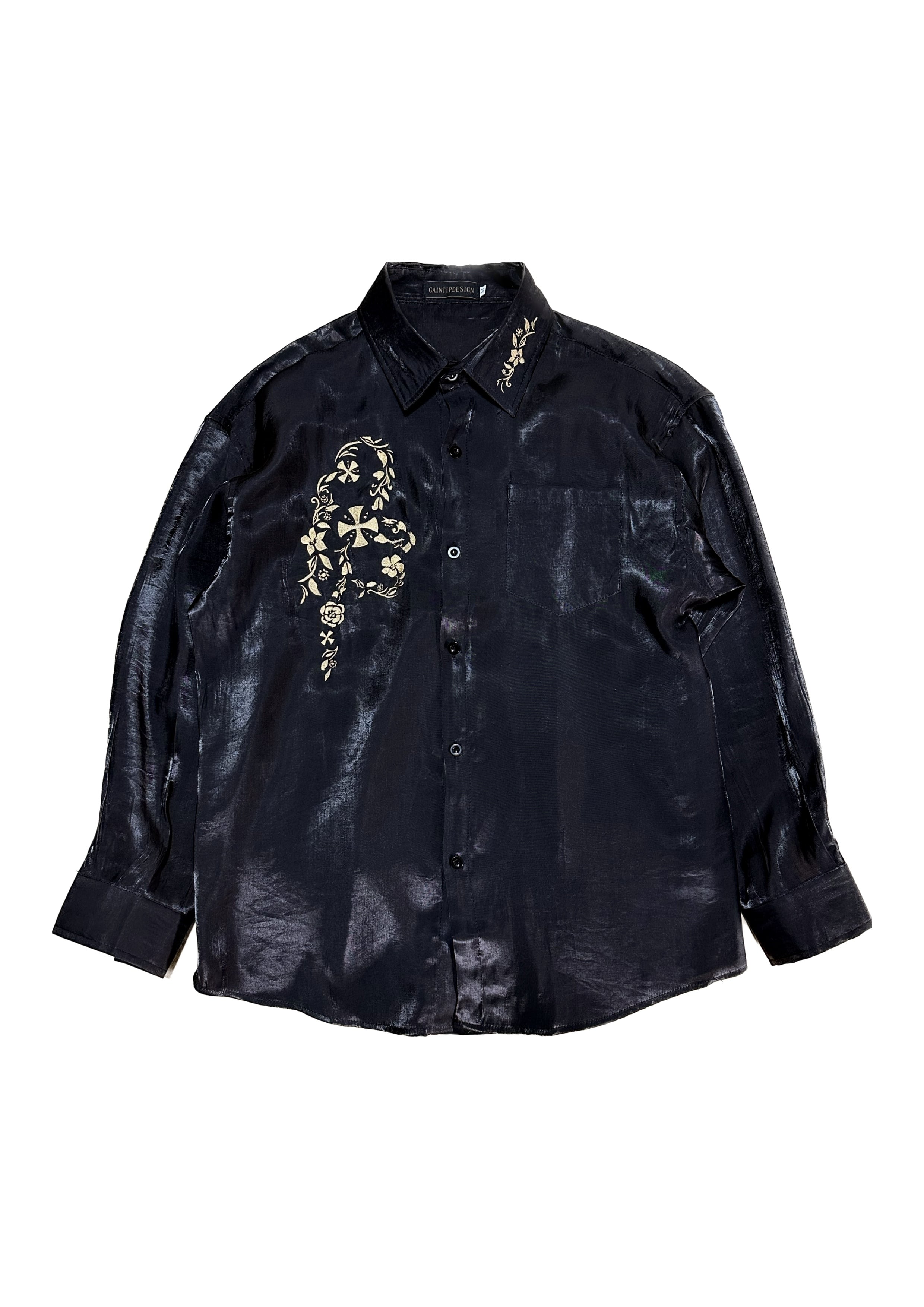This shirt features luxurious polyester fabric with a crinkled texture and luster, offering an elegant sheen hard to achieve with linen or rayon. The abstract embroidery subtly incorporates the brand's iconic "G," creating a sophisticated design that balances elegance and casualness. Unlike conventional polyester shirts, this one is made extremely thin for excellent breathability, combining comfort with a crinkled texture for all-day relaxation. It embodies Gain Tip Design's mixture rude style, elevating your look to the next level.