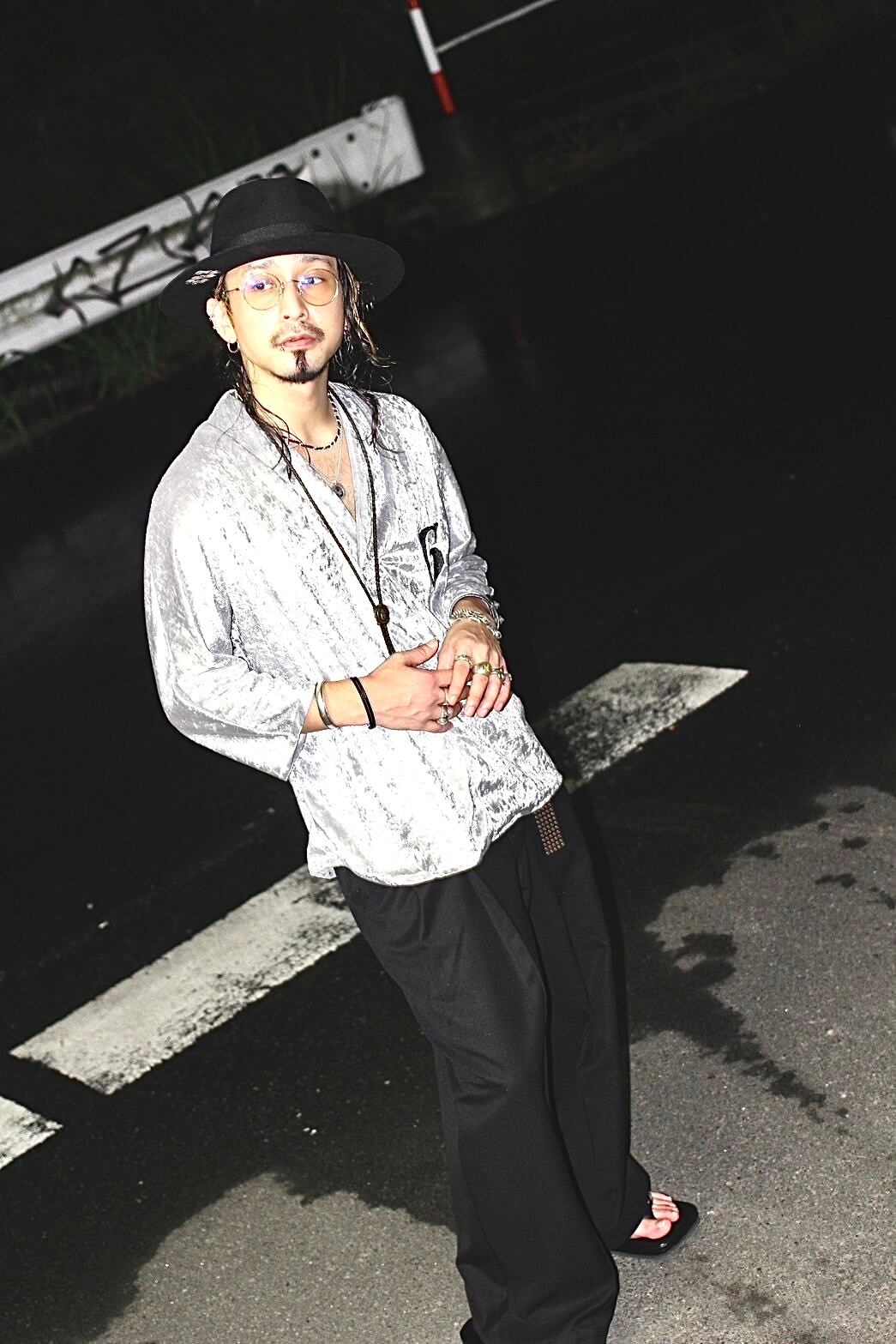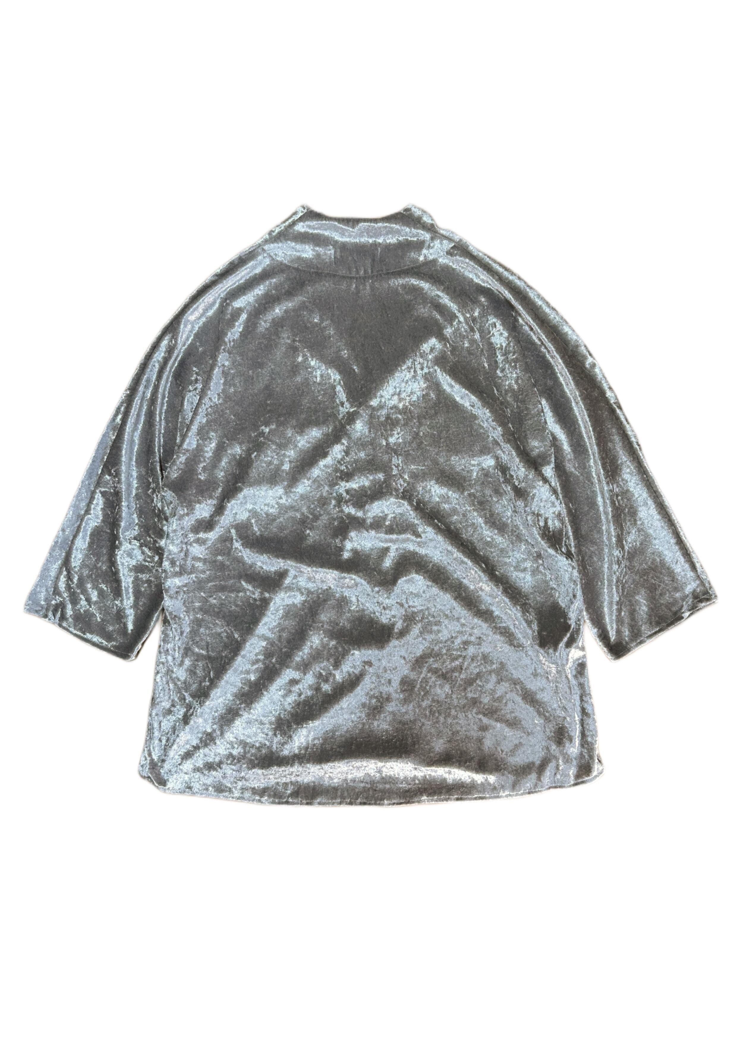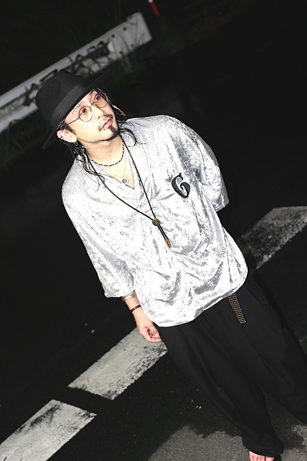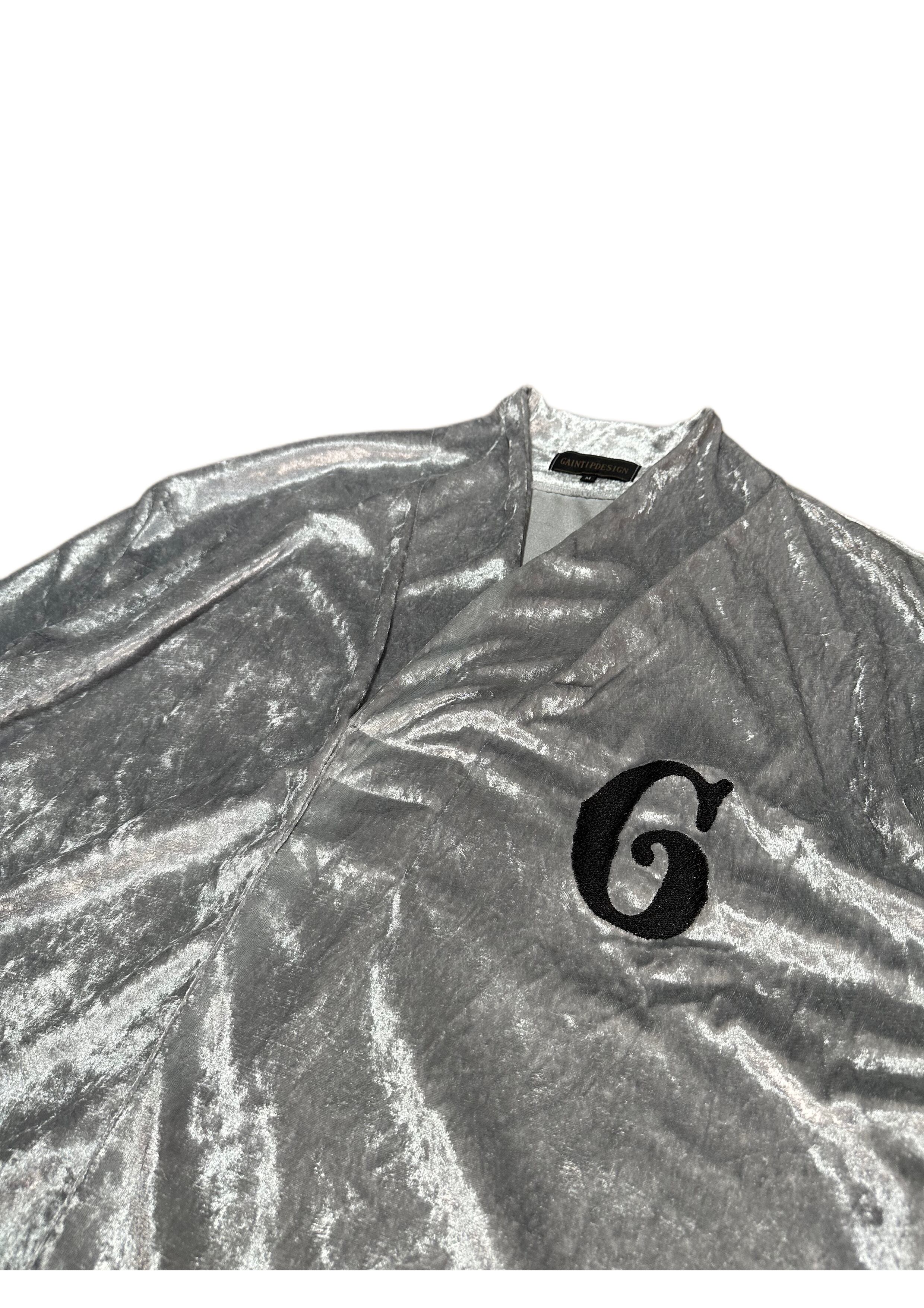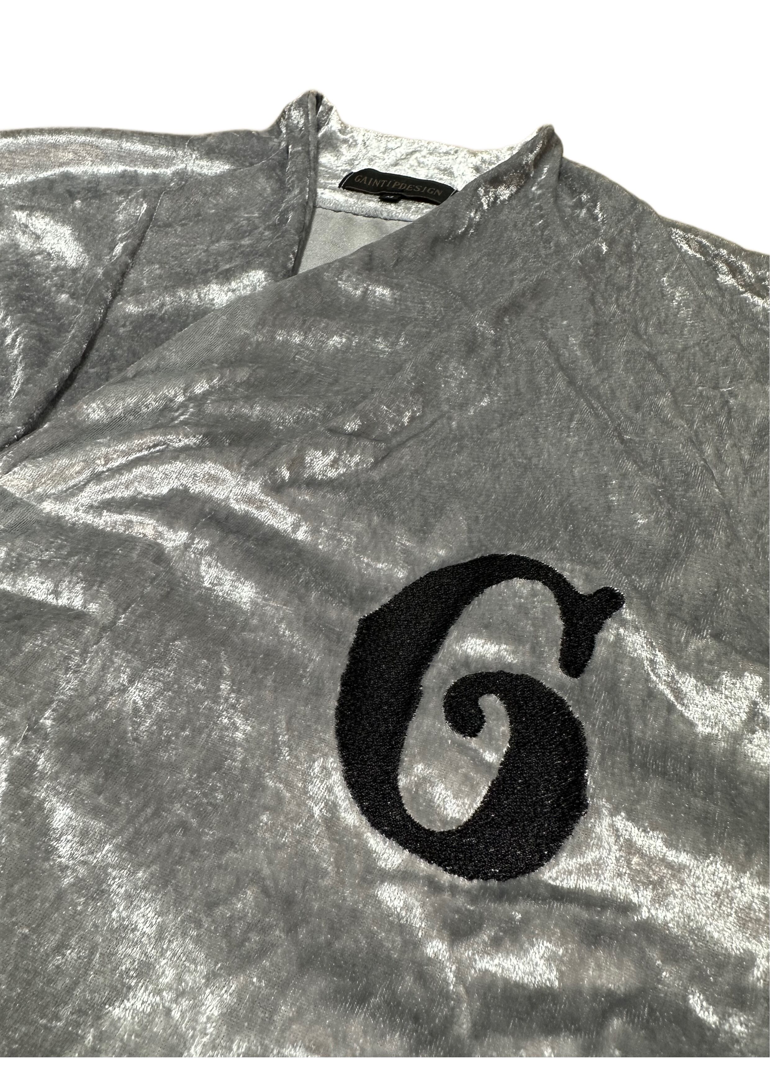 This piece fuses traditional Japanese elements with a rude style. Inspired by the shapes of the collar and sleeves from a happi coat, it is designed to be a real-life wearable item that easily integrates into everyday fashion. Made from luxurious crushed velvet fabric, the impactful "G" logo embroidered on the chest seamlessly blends the elegance of traditional Japanese aesthetics with the edginess of street style.
