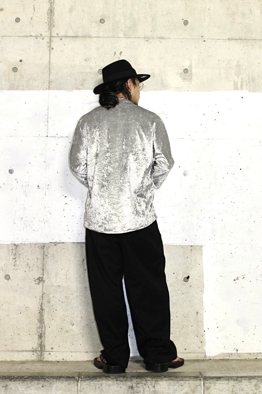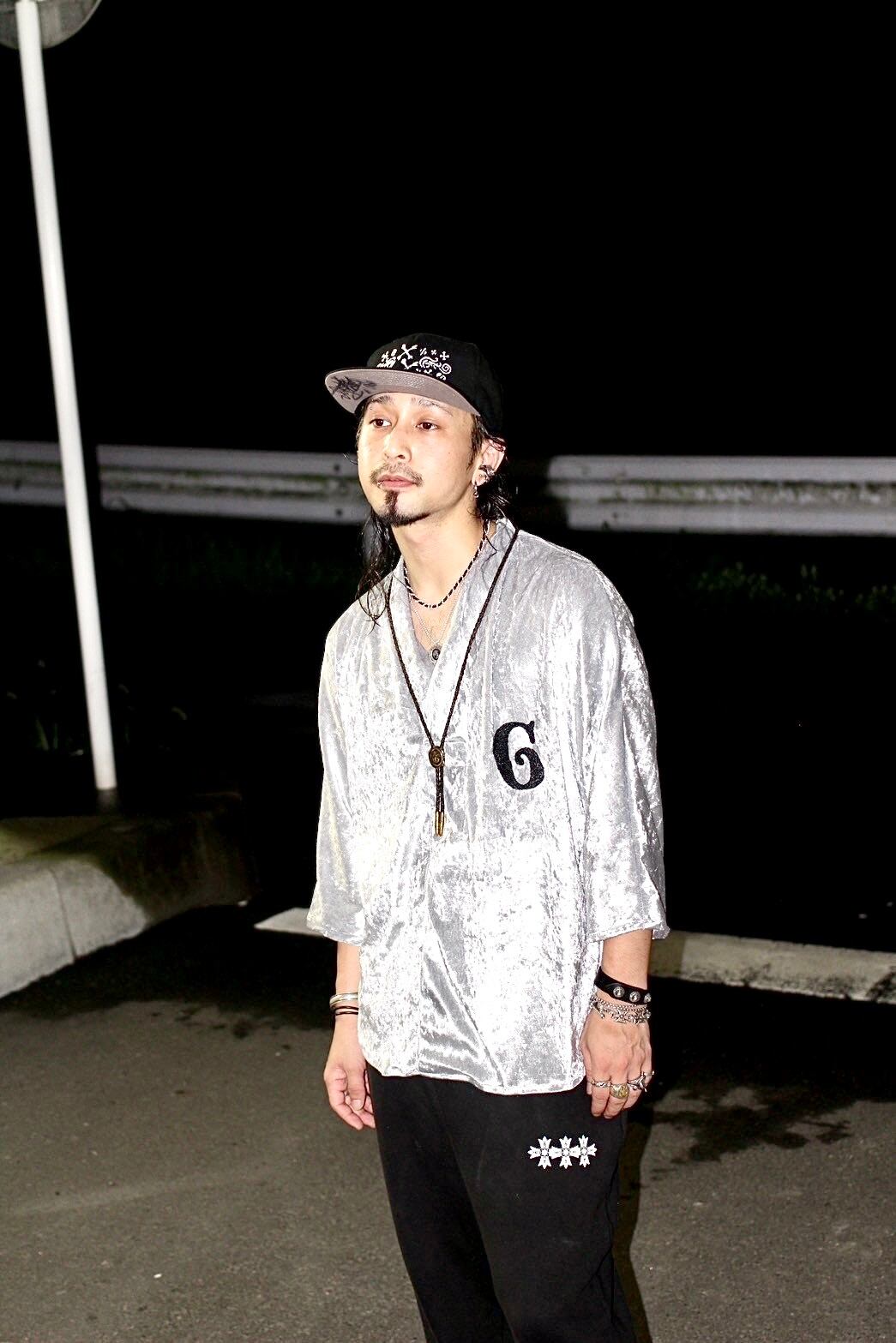 和の伝統とルードスタイルを融合させた一着です。法被からインスピレーションを得た襟と袖の形状を取り入れ、リアルクローズとして日常に取り入れやすいデザインに仕上げました。高級感のあるクラッシュベロア生地を使用し、胸元にはインパクトのある「G」ロゴを刺繍することで、和の美しさとルードのスタイルを絶妙にミックスしています。